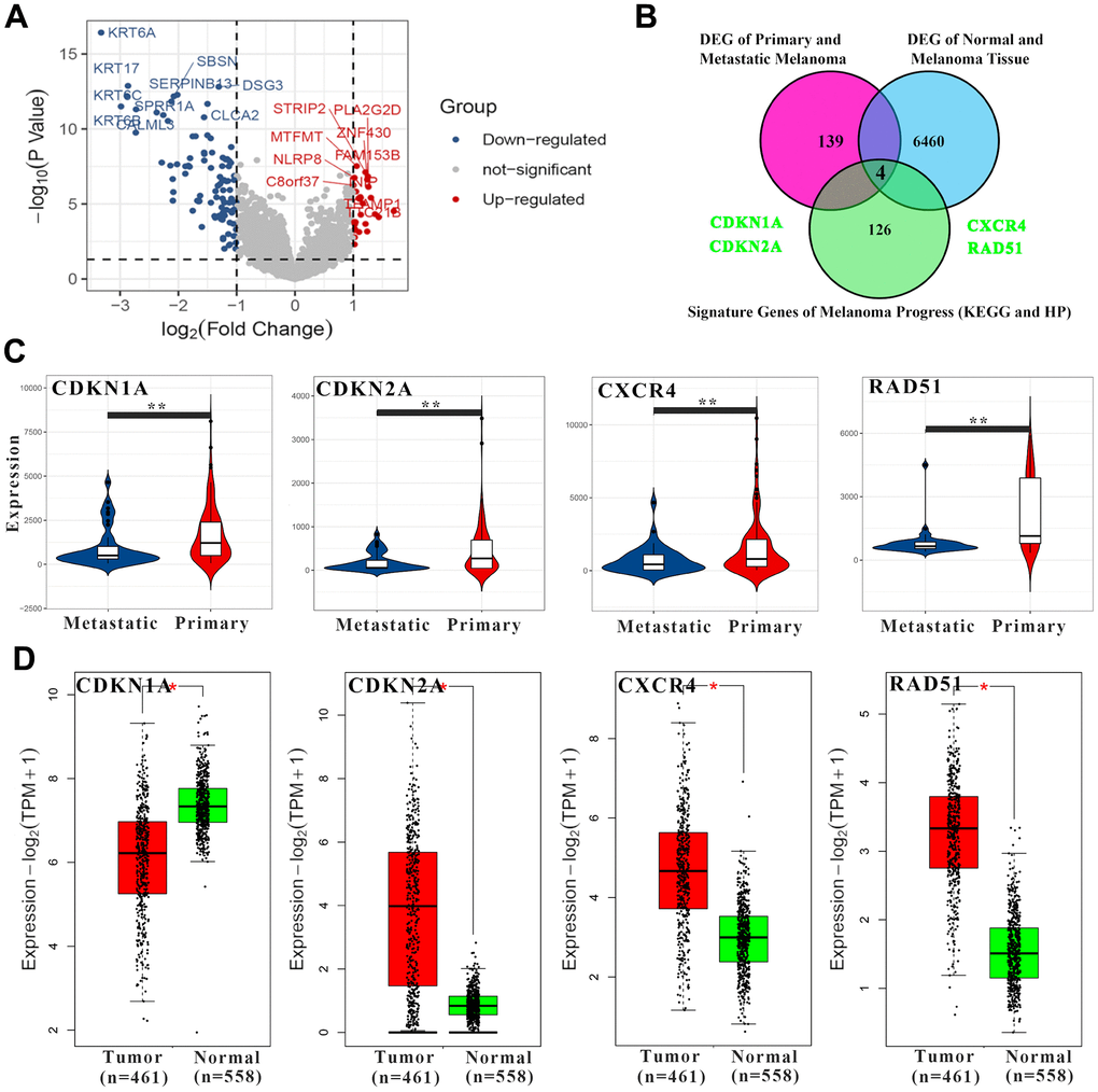Molecular differences in different types of melanoma may exist in the tumorigenesis stage, not acquired in the development stage. To prove this point, by analyzing the TCGA database in the melanoma and transcriptome data of normal skin tissues, 6464 DEGs were screened. In addition, a total of 143 DEGs were screened in comparison between primary and metastatic melanoma (Figure 2A). There were 130 correlated genes in melanoma pathway (according to KEGG and HP databases) (Figure 2B). Among them, CDKN1A, CDKN2A, CXCR4 and RAD51 were significantly down-regulated in metastatic melanoma when compared with the primary type (Figure 2C). Meanwhile, CDKN2A, CXCR4 and RAD51 were significantly up-regulated in melanoma compared with normal skin except CDKN1A (significantly down-regulated) (Figure 2D). Therefore, it is speculated that these four genes may play an important role in the occurrence and development of melanoma. Notably, both CDKN1A and CDKN2A belong to the same family (cyclin dependent kinase inhibitor) and show the same change trend in the tumor development stage while with different trends in the development stage. The main reasons for this phenomenon may be due to the different positions of CDKN1A and CDKN2A in the melanoma pathway and cell cycle pathway, as well as differences in upstream regulatory networks (eg. TP53 and GADD45B). To fully understand the role of CDKN1A, CDKN2A, CXCR4 and RAD51 in clinical melanoma patients, a genetic panorama with relevant clinical information (mutation spectrum, sex, diagnosis age, American Joint Committee on Cancer Metastasis Stage Code, overall survival, disease free, American Joint Committee on Cancer Tumor Stage Code) was drawn. In melanoma patients, CDKN1A (14%) and CDKN2A (34%) had a very high frequency of genetic aberration (inframe mutation, missense mutation, truncating mutation, amplification, deep deletion, mRNA high, mRNA low, protein high and low). In addition, it was also found that CDKN1A and CXCR4 have high levels of methylation (Supplementary Figure 3A). Both methylation and mutation may change expression levels. It may also explain why CDKN1A and CDKN2A, which belong to the same family, show different expression trends. Furthermore, the receiver operating characteristic (ROC) curves and survival curves were calculated (Supplementary Figure 3B, 3C). It was shown that only RAD51 had good clinical predictive properties (area under curve value=79.0096) while only CXCR4 (lower level, p-value=0.021) and RAD51 (higher level, p-value=0.027) could lead to poorer prognosis.