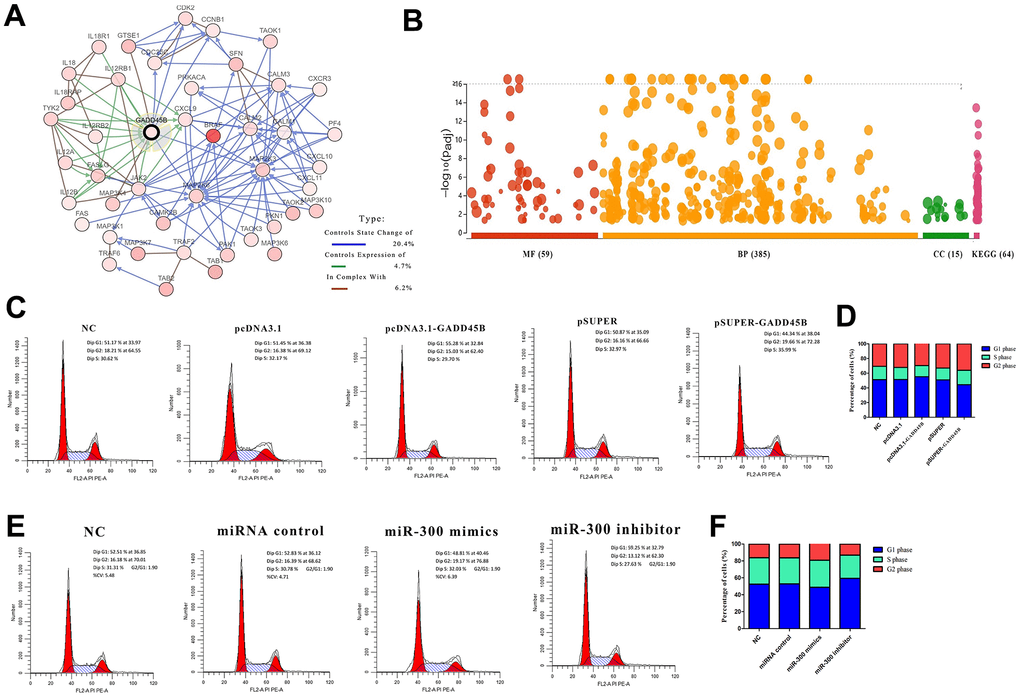 In our previous study on melanoma [34], GADD45B, a key protein regulating melanoma development was screened with miR-300, an upstream regulatory element. A molecular interaction network centered on GADD45B was constructed with 44 genes based on the cBioPortal and String database (Figure 3A). By constructing a melanoma prognosis model based on the expression profiles of molecular network genes, the patient cohort can be successfully divided into high risk (median time=4.1) and low risk group (median time=11.5). It might be suggested that GADD45B was a significant factor which regulate prognosis in melanoma (LogRank p-value=4.82e-10, HR=2.395, 95%CI (1.819, 3.153)) (Supplementary Figure 4). To explore the specific biological effects of this molecular network in melanoma, enrichment analyses were performed using the DAVID Database and found that these genes may be involved in a total of 385 BP, 15 CC, 59 MF and 64 KEGG pathways, such as cell proliferation, migration, apoptosis and cell cycle (Figure 3B). Transfected GADD45B expression or interference vectors and miR-300 mimics or inhibitors into A375 cells, the proportion of cells in G1, S, and G2 phases were detected via flow cytometry. Statistically, when transfected with GADD45B expression vector or miR-300 inhibitors to up-regulate intracellular GADD45B level, the number of cells in G1 phase significantly increased (55.28% and 59.25%) (p-value<0.05), and the number of cells decreased in S phase (29.70% and 27.63%) and G2 phase (15.03% and 13.12%) (p-value<0.05). Conversely, when transfection of GADD45B interfering vector or miR-300 mimics decreased the level of GADD45B in melanoma cells, the number of cells in G1 phase decreased (44.34% and 48.81%) (p-value<0.05), and the cell volume increased in S phase (35.99% and 32.03%) and G2 phase (19.66% and 19.17%) (p-value<0.05), indicating that the proportion of cells undergoing DNA replication and mitosis increased (Figure 3C–3F). Therefore, it was suggested that miR-300 may promote cell cycle progression in melanoma via GADD45B.