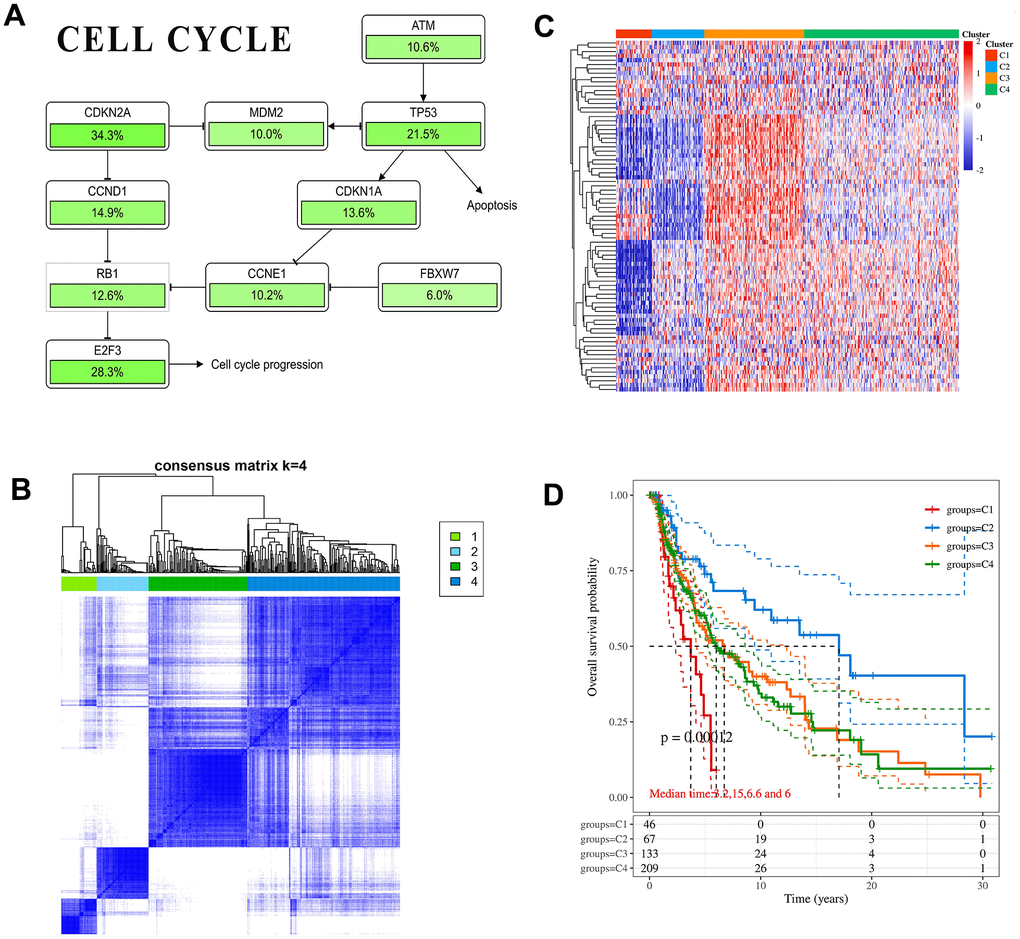Through literature review and comparison of core genes in pathways, only CDKN1A and CDKN2A are involved in cell cycle pathways (Figure 4A and Supplementary Figure 5A, 5B) [35, 36]. In addition, CDKN1A is regulated by TP53, and CDKN2A can inhibit TP53 expression through MDM2. Immunohistochemical analysis showed that compared with normal tissues, the protein level of CDKN1A was significantly down-regulated in melanoma, while the CDKN2A protein level was significantly up-regulated (Supplementary Figure 5C). It was consistent with the trend of mRNA level. However, CDKN1A and CDKN2A expression differences have not been found in different subtypes of melanoma (Supplementary Figure 5D), suggesting that CDKN1A and CDKN2A may become new type markers. The melanoma patients in TCGA were divided into 4 subtypes by cell cycle pathway-related genes (Figure 4B). After cluster analysis, significant differences in molecular expression were identified (Figure 4C). The median survival time of each subtype in the 4 groups was 3.2 years, 15 years, 6.6 years and 6 years, respectively (Figure 4D). The prognosis of subtype 1 was the worst, and the prognosis of subtype 2 was significantly better than that of other patients (p-value =0.00012). It indicated that in patients with melanoma when cell cycle pathways are activated to different degrees, the expression changes of pathway-related genes are different, which will directly affect the development of melanoma.