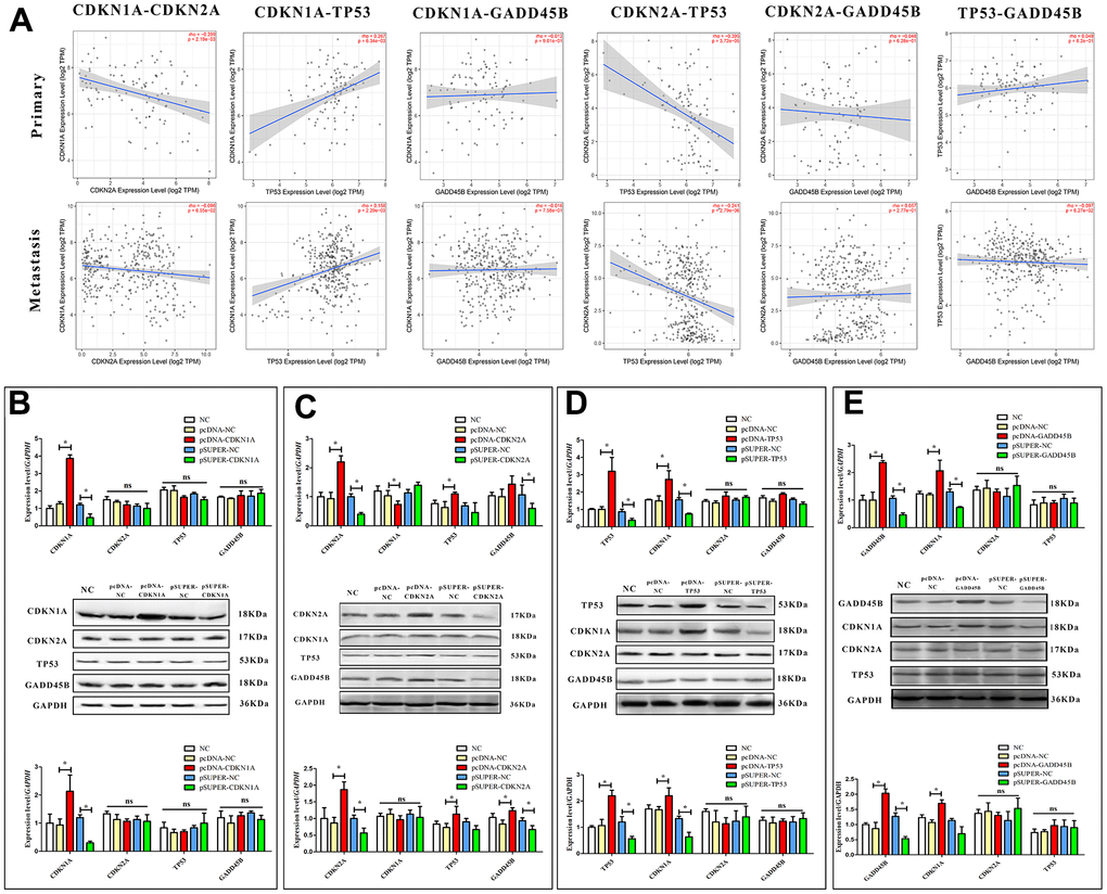 As a key regulator of the cell cycle, TP53 has been shown to be involved in regulating the expression of GADD45 family proteins by CATG motifs in cell-cycle arrest and DNA repair [37]. Obviously, TP53 and CDKN1A/CDKN2A are in the same signaling pathway, and there is a definite regulatory relationship [35, 38]. Thus, it was supposed that CDKN1A, CDKN2A, TP53 and GADD45B may be involved in the regulation of the melanoma cell cycle, but the specific regulatory relationship between each factor needs to be further confirmed. To this end, we first conducted correlation statistics on primary and metastatic melanoma according to the expression levels of each gene in clinical samples. It was found that TP53 was negatively correlated with CDKN2A in both types of melanoma, while it was positively correlated with CDKN1A. A negative correlation between CDKN1A and CDKN2A was found, especially in primary melanoma. (Figure 5A) To further confirm the accuracy of correlation analysis and clarify the regulatory relationship, expression and interference vectors of each gene were transfected into melanoma cells respectively. The expression changes of other genes were detected from the mRNA and protein levels. Finally, CDKN2A may be located upstream of the signal axis, positively regulating the expression of TP53 and GADD45B. CDKN1A is located downstream of TP53 and GADD45B. Interestingly, CDKN1A was found to be negatively regulated by CDKN2A on mRNA level in A375 cells, but there was no significant difference in protein level. It was also confirmed that TP53 and GADD45B may not have a regulatory relationship (Figure 5B–5E).
