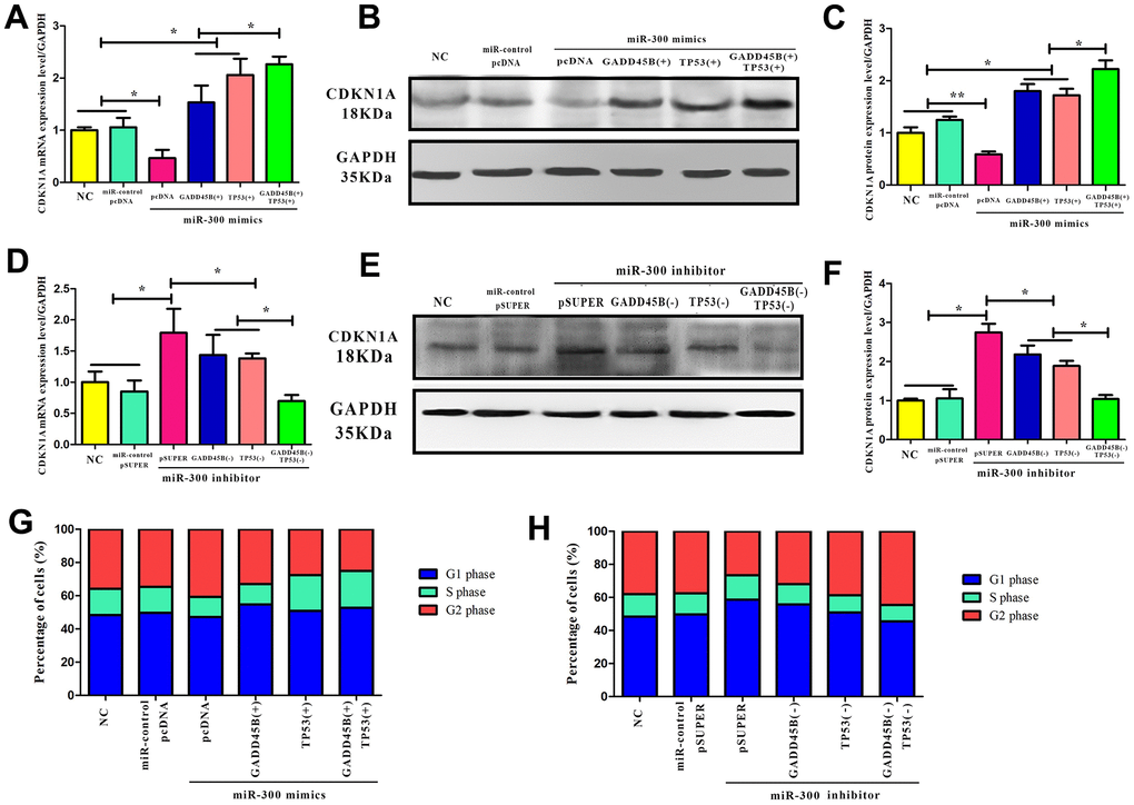 Since CDKN1A is a downstream target of TP53 and GADD45B. To confirm that miR-300 can regulate CDKN1A expression through TP53 and GADD45B, it was found that miR-300 indirectly changed the level of intracellular CDKN1A by posttranscriptional inhibit the expression of TP53 or GADD45B (Figure 7). The overexpression or interference vector of TP53 and GADD45B were transfected simultaneously in melanoma cells. It was found that TP53 regulated CDKN1A earlier than GADD45B and the regulation effect was more significant, presumably due to TP53’s transcription factor activity and higher affinity with downstream genes (Figure 7A–7F). As well known, CDKN1A is a classical cyclically dependent kinase inhibitor that effectively blocks cell cycle progression. Flow cytometry detection revealed that in melanoma cells, TP53 and GADD45B may mediate miR-300 regulating the expression of CDKN1A, and further promoting the cell cycle transition from the G1/S phase to the G2 phase (Figure 7G, 7H).