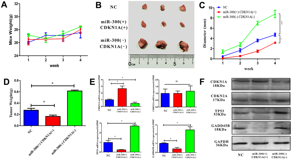 CDKN1A is a key factor in regulating the progress of the G1/S phase of the cell cycle. Abnormal expression of CDKN1A will directly affect the cell cycle. In vitro experimental results, miR-300 may indirectly inhibit CDKN1A expression through TP53 and GADD45B. To confirm the carcinogenic effect of miR-300 in vivo, a nude mouse model with heterograft was constructed. The weight and tumor diameter of the mice were measured weekly after tumor cell injection. During the experiment, the body weight of the mice did not fluctuate significantly and remained between 25 and 30 g (Figure 8A). After 4 weeks, the tumor tissue was taken out for diameter measurement and weight measurement (Figure 8B). Compared with normal control group, the tumors in miR-300(+)CDKN1A(+) were smaller (diameter=2.5 mm) while those in miR-300(-)CDKN1A(-) were larger (diameter=8.3 mm). The expression level of CDKN1A is up-regulated, which can effectively weaken the promoting effect of miR-300 on tumor growth (about 2 mm) (Figure 8C, 8D). The mRNA and protein levels of CDKN1A, CDKN2A TP53 and GADD45B in tumor tissues were detected after the tissue was broken. Compared with the control group, the expressions of miR-300 and CDKN1A were up-regulated simultaneously (p-value<0.05), and CDKN2A was not significantly changed (p-value>0.05). TP35 and GADD45B were down-regulated by miR-300 (p-value<0.05) and vice versa (Figure 8E, 8F).