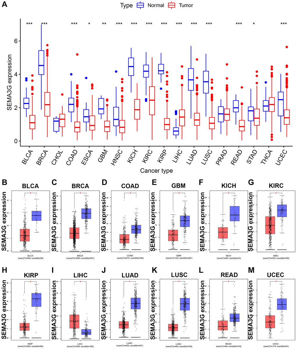 To explore the expression levels of SEMA3G in human cancer, a pan-cancer analysis was performed. By usage of TCGA cancer and normal data, we found that SEMA3G was significantly downregulated in most of cancer types, including BLCA, BRCA, COAD, ESCA, GBM, HNSC, KICH, KIRC, KIRP, LUAD, LUSC, READ, STAD and UCEC (Figure 1A). However, in LIHC, SEMA3G expression in cancer tissues was markedly increased when compared with normal tissues. In order to further validate the analytic result, GEPIA database was introduced, which contains TCGA and GTEx normal expression data. As shown in Figure 1B–1M, identical with the above result, SEMA3G was obviously decreased in BLCA, BRCA, COAD, ESCA, GBM, HNSC, KICH, KIRC, KIRP, LUAD, LUSC, READ, STAD and UCEC and upregulated in LIHC cancer tissues when compared with corresponding normal controls. These findings suggest that SEMA3G might act as a key regulator in carcinogenesis of these pointed human malignancies.