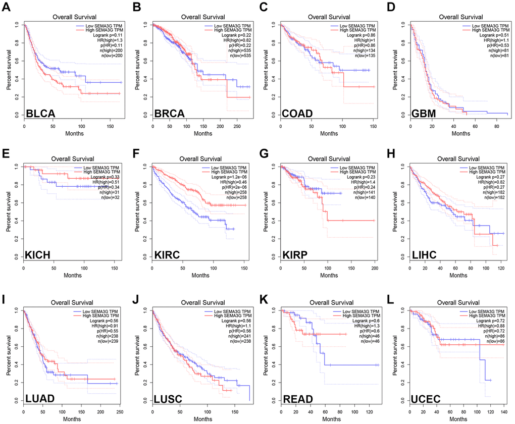 In this study, we firstly determined the expression levels and prognostic values of SEMA3G in multiple human malignancies by integration of TCGA and GTEx cancer and normal expression and survival data. The result suggested that SEMA3G was significantly downregulated in KIRC compared with normal controls and its high expression indicated favorable overall survival and disease-free survival of KIRC. To date, the role of SEMA3G in KIRC has not been detected and needs to be further explored. However, SEMA3G was reported to exert anti-tumor effects in migration and invasion of glioma [6]. Therefore, SEMA3G might be a potential tumor suppressor and favorable prognostic biomarker in KIRC.