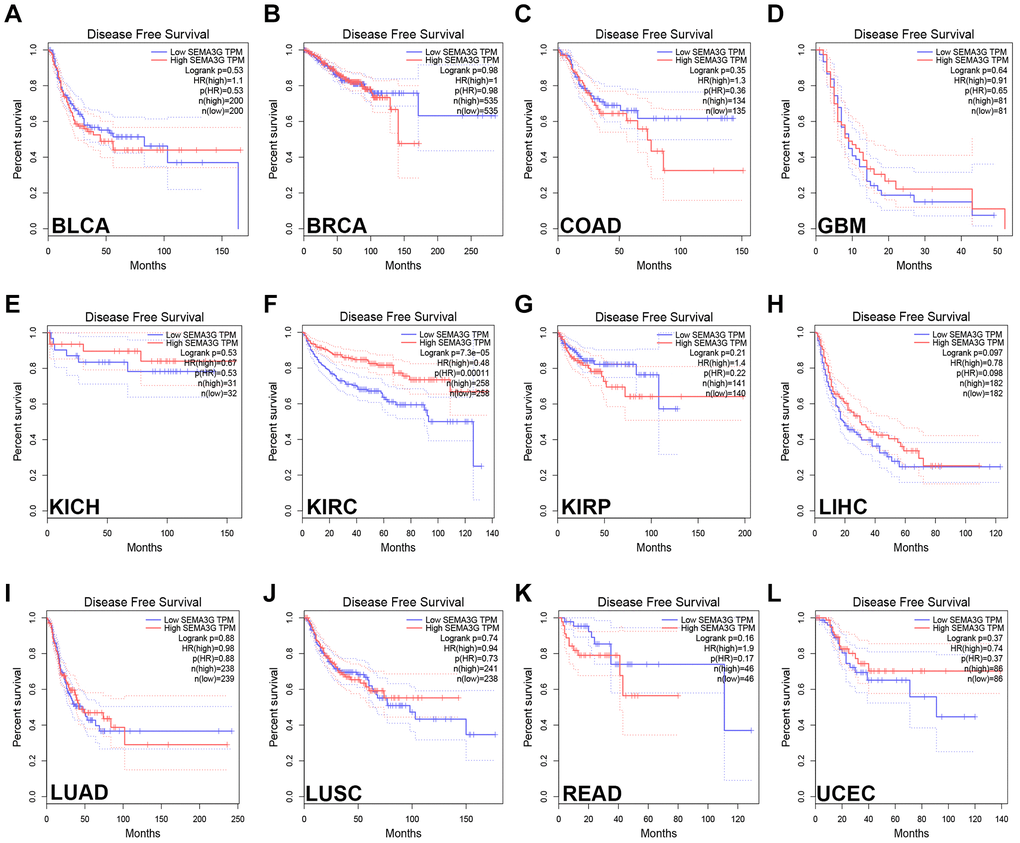 Next, the prognostic values of SEMA3G in BLCA, BRCA, COAD, ESCA, GBM, HNSC, KICH, KIRC, KIRP, LIHC, LUAD, LUSC, READ, STAD and UCEC was assessed. Two prognostic indices, consisting of overall survival (OS) and disease-free survival (RFS), was included. As presented in Figure 2, only KIRC patients with high expression of SEMA3G indicated favorable OS. Intriguingly, KIRC patients with higher expression of SEMA3G possessed better RFS as shown in Figure 3. No statistical significance of SEMA3G for predicting patients’ prognosis in other types of human cancer was observed. Taken together, SEMA3G might be a promising favorable prognostic biomarker in KIRC.