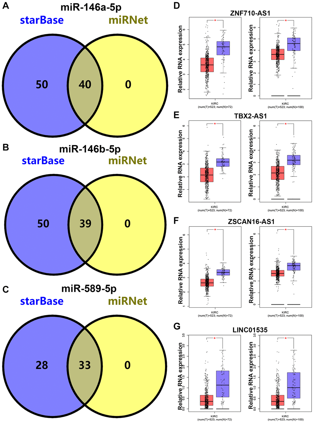The possible lncRNAs that could potentially bind to miR-146a-5p, miR-146b-5p or miR-589-5p were predicted by two online tools, consisting of starBase (http://starBase.sysu.edu.cn/) and miRNet (http://www.mirnet.ca/) database [11, 12]. Next, intersection analysis was performed to further obtain most potential binding lncRNAs that commonly appeared in the two prediction databases by VENNY2.1 (https://bioinfogp.cnb.csic.es/).