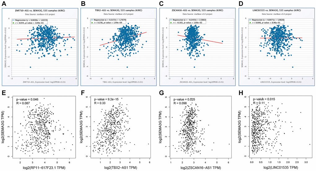 Subsequently, upstream potential lncRNAs of miR-146a-5p, miR-146b-5p and miR-589-5p were predicted. Two databases, consisting of starBase and miRNet, were employed. As shown in Figure 5A–5C, 40, 39 and 33 lncRNAs were respectively found to potentially bind to miR-146a-5p, miR-146b-5p and miR-589-5p. Next, the expression correlation of the three miRNAs with their corresponding lncRNAs was assessed in KIRC. As listed in Supplementary Table 1, six lncRNAs were negatively correlated with miR-146a-5p, including EPB41L4A-AS1, SNHG7, SLC25A21-AS1, TBX2-AS1 and LINC00665. For miR-146a-5p, there were also several negatively correlated lncRNAs in KIRC, consisting of MIR4453HG, EPB41L4A-AS1, ZSCAN16-AS1, HCG18, LINC02538, EBLN3P, LINC00963, SNHG7, CCDC183-AS1, NEAT1, SLC25A21-AS1, LINC02288, ZNF710-AS1, TBX2-AS1, LINC00665, LINC01535 and XIST (Supplementary Table 2). As presented in Supplementary Table 3, miR-589-5p was significantly inversely linked to LINC01128 and ZFAS1 in KIRC. Followingly, expression levels of the 19 lncRNAs in KIRC were detected by using TCGA cancer data, TCGA normal data and GTEx normal data. The results demonstrated that 4 of 19 lncRNAs, including ZNF710-AS1, TBX2-AS1, ZSCAN16-AS1 and LINC01535, were markedly downregulated in KIRC cancer tissues when compared with normal tissues (Figure 5D–5G). Finally, we assessed the expression correlation of the four lncRNAs with SEMA3G in KIRC. As presented in Figure 6A–6H, SEMA3G was significantly positively correlated with TBX2-AS1 in KIRC, which was in accordance with the ceRNA hypothesis. Collectively, TBX2-AS1 was the potential upstream regulatory lncRNA of miR-146a-5p/miR-146b-5p-SEMA3G axis in KIRC.