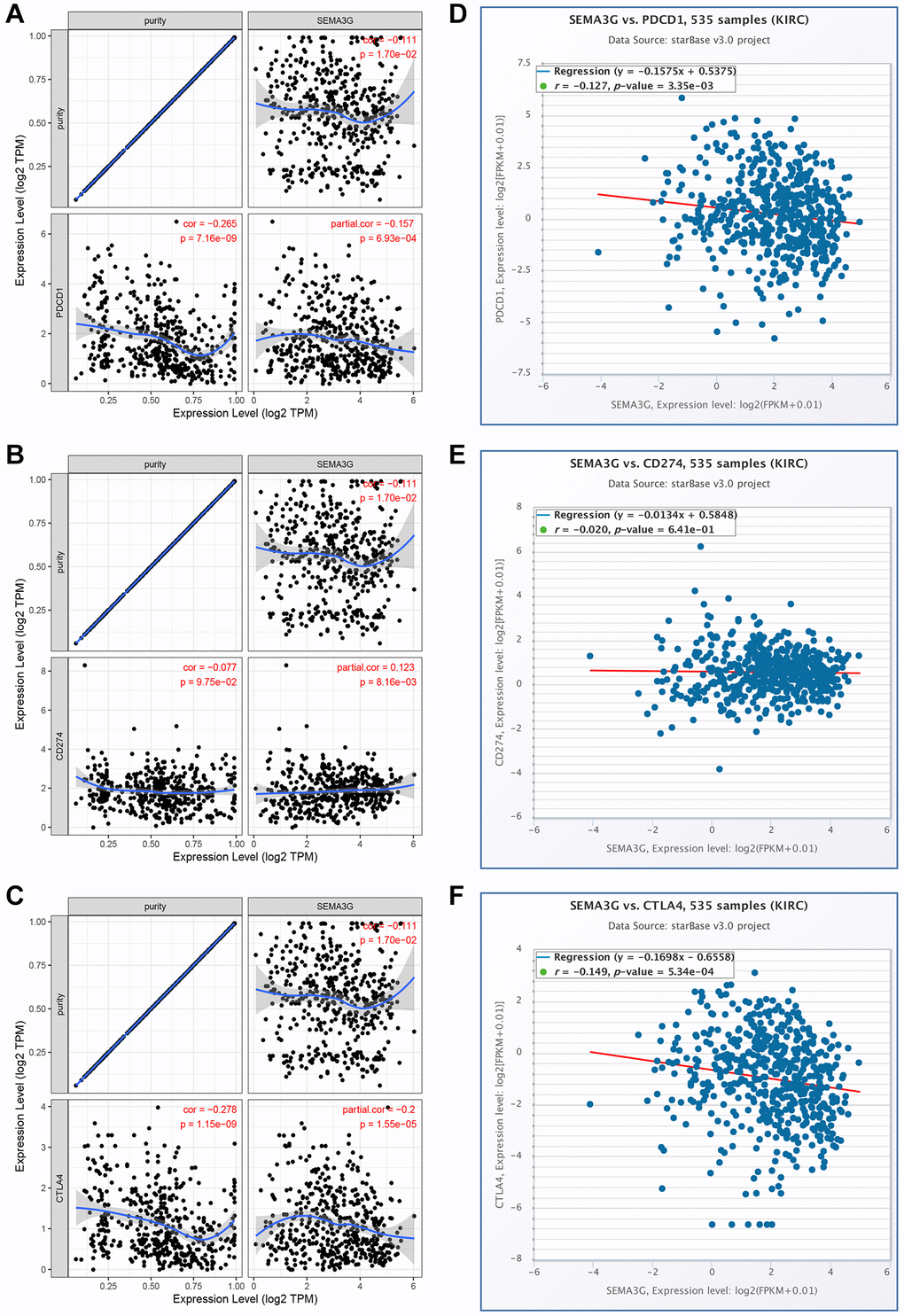 Considering the close relationship of SEMA3G with tumor immune infiltration in KIRC, we further assessed the correlation of SEMA3G expression with the levels of immune checkpoints (PD-1, PD-L1 and CTLA4). As shown in Figure 8A–8C, by analyzing TIMER database, SEMA3G expression was significantly negatively correlated with PD-1 or CTLA-4 level but was statistically positively associated with PD-L1 level in KIRC when was adjusted by purity. For further improving analytic accuracy, starBase database was also employed to evaluate expression correlation of SEMA3G with immune checkpoints in KIRC. As presented in Figure 8D–8F, SEMA3G expression was also markedly negatively linked to PD-1 or CTLA-4 level in KIRC. However, no significant expression correlation of SEMA3G with PD-L1 in KIRC was observed. It has been widely acknowledged that immune checkpoints are responsible for tumor immune escape. Thus, our present findings suggest that SEMA3G might be involved in the immune scape of KIRC.