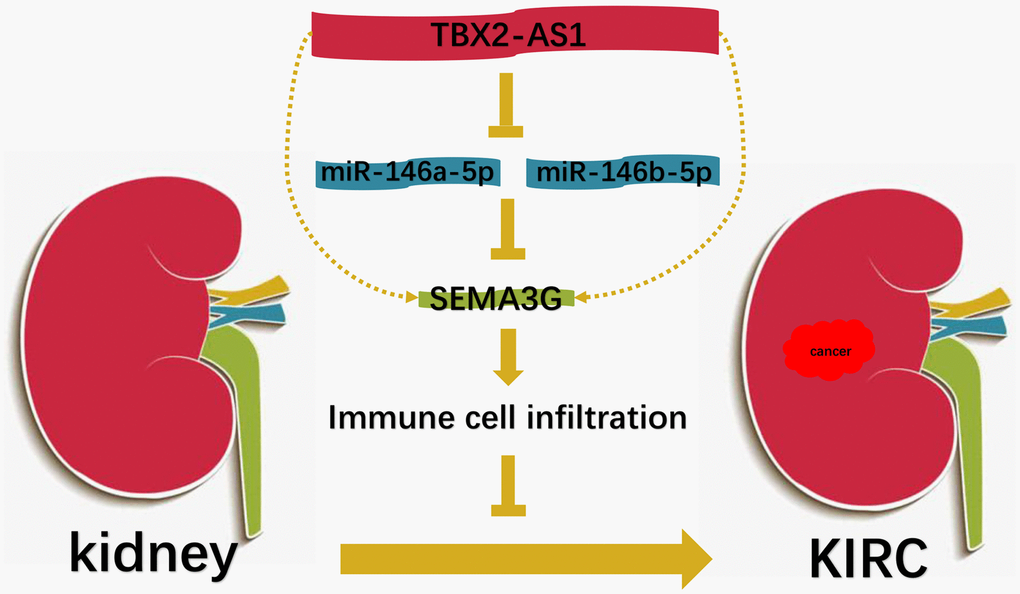 Taken together, by performing a series of in silico analyses, we showed that SEMA3G was significantly downregulated in KIRC and possessed favorable prognosis of patients with KIRC, and identified that TBX2-AS1-miR-146a/b-5p pathway, an upstream axis of SEMA3G, was partially responsible for SEMA3G downregulation in KIRC (Figure 9). Furthermore, SEMA3G was markedly linked to tumor immune infiltration and expression of immune checkpoints in KIRC. However, there are some limitations in this work. For example, the results from this work were based on bioinformatic analysis; lack of the downstream action mechanism exploration of SEMA3G in KIRC. Thus, the current findings need to be further validated by much more basic experiments and clinical trials in the future.