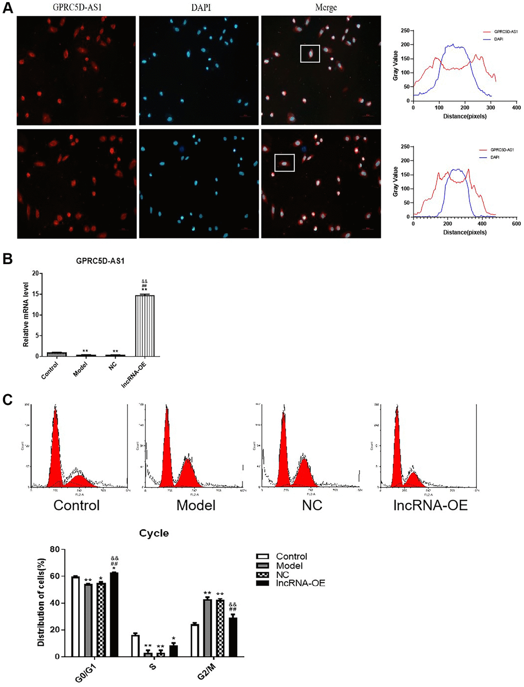 Besides, apoptosis rates were significantly high in the model group based on flow cytometric detection of apoptotic cells. The apoptotic rate of the overexpression group presented a drastic decline in comparison with model group, which suggested that GPRC5D-AS1 overexpression could inhibit atrophy cell apoptosis (Figure 2B). The quantitative analysis of the results of cell apoptosis was shown in Figure 2C.