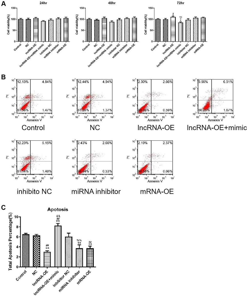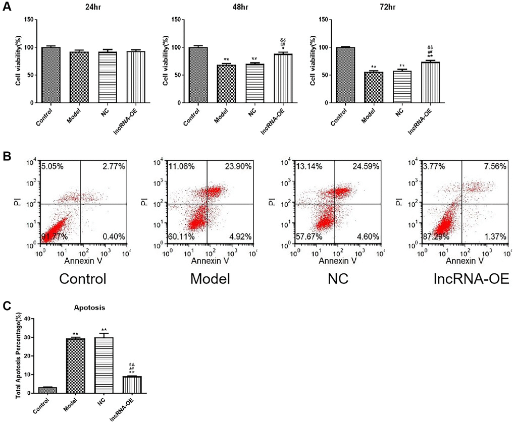 Next, we investigated whether overexpression of GPRC5D-AS1 influenced cell proliferation and cell apoptosis. In order to measure cell viability, CCK-8 assays were performed at different time points. As determined by the CCK-8 assay, significant reductions in cell viability were observed in the atrophied skeletal muscle myoblasts compared with the control group at 48 and 72 hours. Notably, overexpression of GPRC5D-AS1 could significantly increase cell viability, which reversed reduction to varying degrees in model cells (Figure 2A).