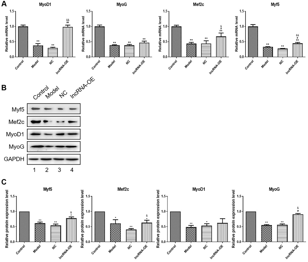 Our experiments validated the effect of GPRC5D-AS1 on myogenesis and differentiation in skeletal muscle by detecting the levels of MyoD1, Myf5, Mef2c and MyoG mRNA and protein expression. Based on Figure 3, the dexamethasone-induced muscle atrophy cell model showed significant decreases in these four factors. Their expression at mRNA level were enhanced by transfection with GPRC5D-AS1-OE (Figure 3A). The results obtained by Western blot were consistent with qRT-PCR. Western blot analysis indicated that the expression of MyoD1, MyoG, Mef2c and Myf5 were reduced in model group compared with control. And these muscle regulatory factors expression were upregulated in the GPRC5D-AS1-OE group (Figure 3B, 3C). The above results indicated that GPRC5D-AS1 regulated myoblast differentiation.