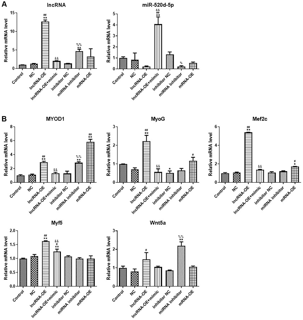 By examining the expression of muscle regulatory factors, we found that overexpression of GPRC5D-AS1 increased the expression of MyoD1, MyoG, Mef2c and Myf5, and this phenomenon can be reversed by adding miR-520d-5p mimic, making the expression levels lower. It is noteworthy that miR-520d-5p inhibitor could also enhance MyoD1 and Wnt5a expression. Overexpression of MYOD1 could mildly increase other muscle regulatory factors expression at different degrees, including MyoG and Mef2c (Figure 5B).