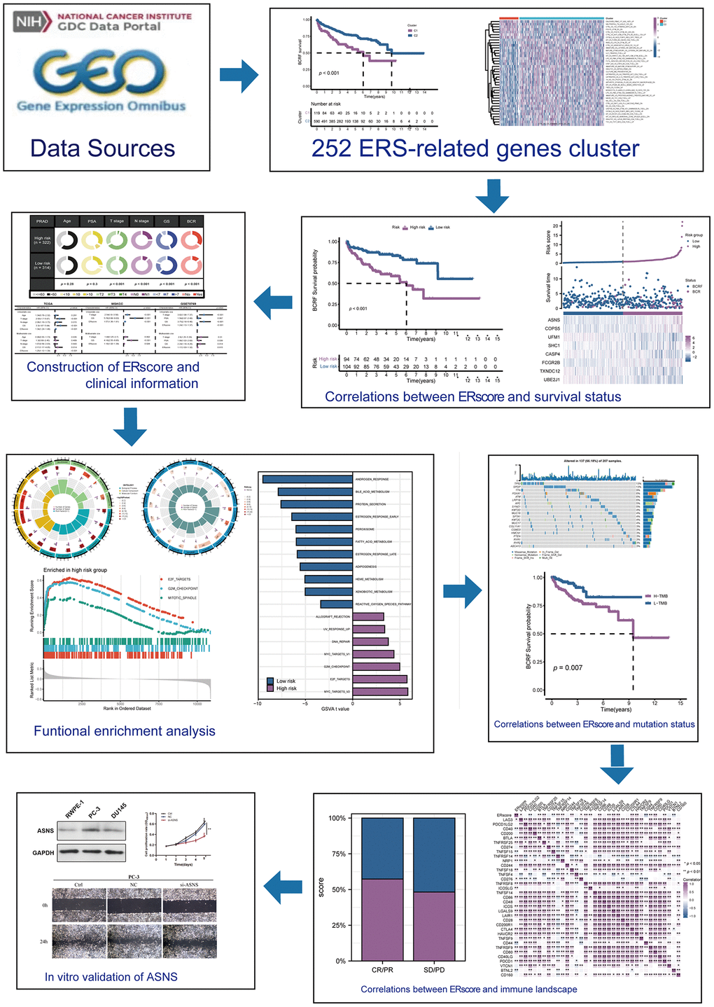 In our study, we obtained transcriptome data and related clinical information based on The Cancer Genome Atlas (TCGA) database and extracted ERS-related gene sets from the Molecular Signature Database (MSigDB). Additionally, we obtained data from the Memorial Sloan-Kettering Cancer Center (MSKCC) and Gene Expression Omnibus (GEO) database. Then, we used the MSKCC and GSE70769 cohorts as the validation set and the TCGA cohort as the training set. We concentrated on researching the effect of ERS-related genes on predicting BCR risk in PRAD patients and examining their possible processes on tumor development and progression by connecting pertinent genes to PRAD clinical cases.
