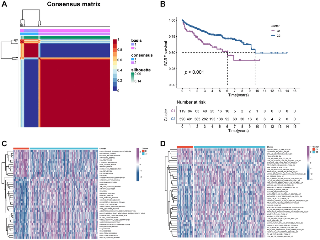 A total of 252 ERS-related genes were downloaded from MSigDB https://www.gsea-msigdb.org/gsea/msigdb/index.jsp and provided in Supplementary Table 1. PRAD samples were clustered into subgroups based on these genes by the Non-negative Matrix Factorization (NMF) approach with the “NMF” R package. We used the Kaplan-Meier survival curves to compare the subgroups’ biochemical recurrence-free (BCRF) survival between the subgroups. Two gene sets (c2.cp.kegg.v7.1.symbols.gmt and c7.all.v7.5.1.symbols.gmt) from the MsigDB database were extracted to estimate the differences in biological functions and immune activities between the subgroups using the Gene Set Variation Analysis (GSVA) with the “GSVA” R package. The statistically significant cutoff for GSVA was p.adjust < 0.05.