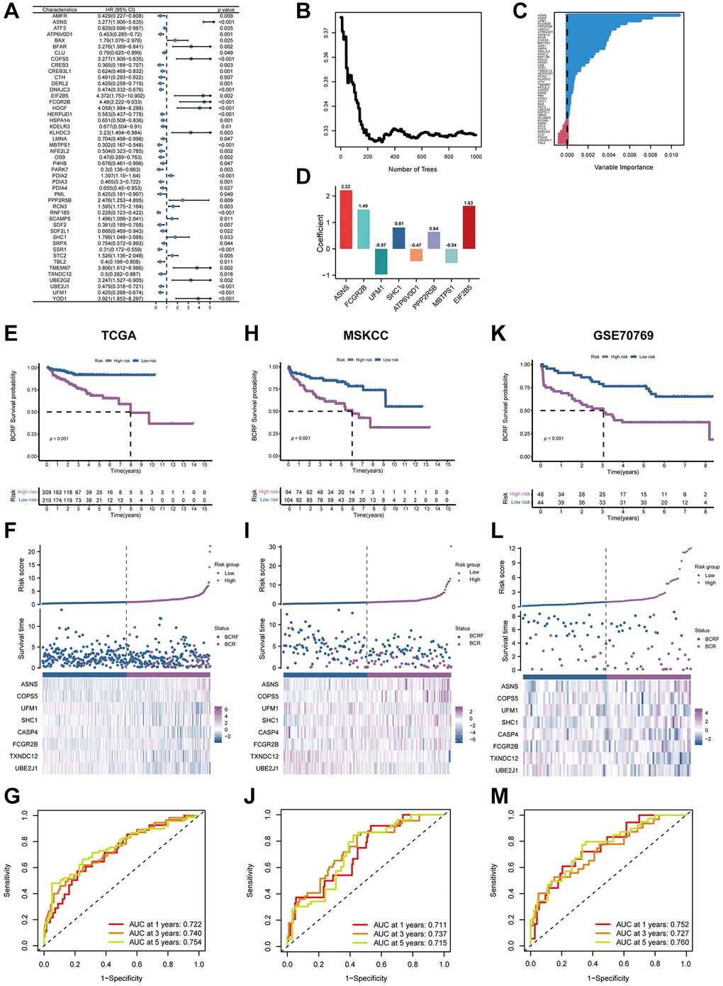 We firstly identified 47 genes associated with prognosis in the TCGA cohort. (Figure 3A). Fourteen candidates were further selected through RSF for model development using minimum depth techniques (Figure 3B, 3C). Using multivariate Cox regression, the last eight relevant genes were selected to create an ERscore, namely ASNS, FCGR2B, UFM1, SHC1, ATP6V0D1, PPP2R5B, MBTPS1, and EIF2B5. The formula was: