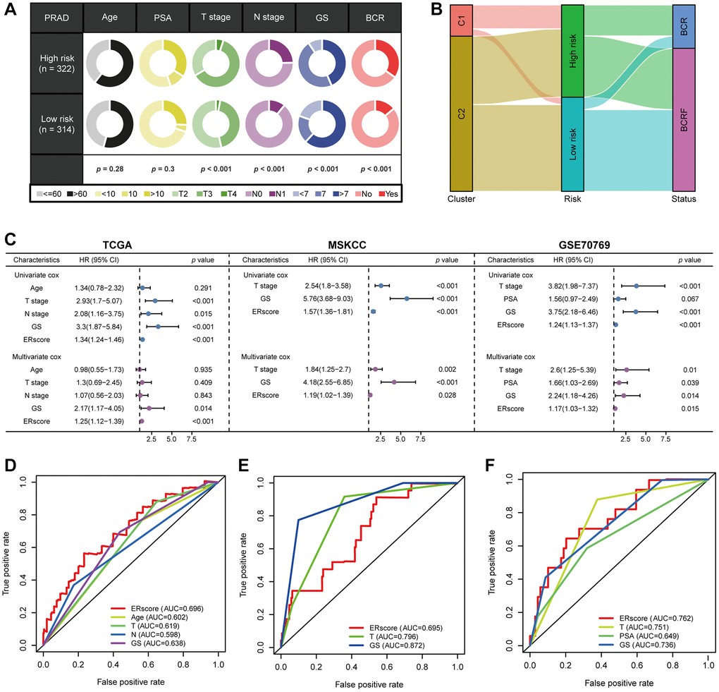 (Table 1, Figure 3D). We classified patients into high- and low-risk groups based on the median ERscore. The high-risk group’s BCRF survival was considerably lower than that of the low-risk group’s (Figure 3E). Figure 3F displayed the ERscore distribution, survival status, and ERscore profile for these individuals. For 1-, 3- and 5-year BCRF survival, the AUCs of the ERscore were 0.722, 0.740, and 0.754, respectively (Figure 3G). We conducted further investigation and discovered that a greater ERscore was linked to a poorer TN stage, a higher GS, and a higher likelihood of BCR (Figure 4A). Moreover, high-risk patients were more likely to come from cluster 1 with a poorer prognosis (Figure 4B). Furthermore, in univariate Cox regression, it was found that ERscore and clinical traits were significantly related to BCRF survival. ERscore was revealed to be an independent predictive predictor (Figure 4C). The accuracy of ERscore’s prediction was also supported by ROC analysis (AUC = 0.696, Figure 4D). The prognostic value of ERscore was also confirmed through the validation set (MSKCC and GSE70769) (Figures 3H–3M and 4E, 4F). These results suggest that ERscore has the potential to guide clinical treatment.