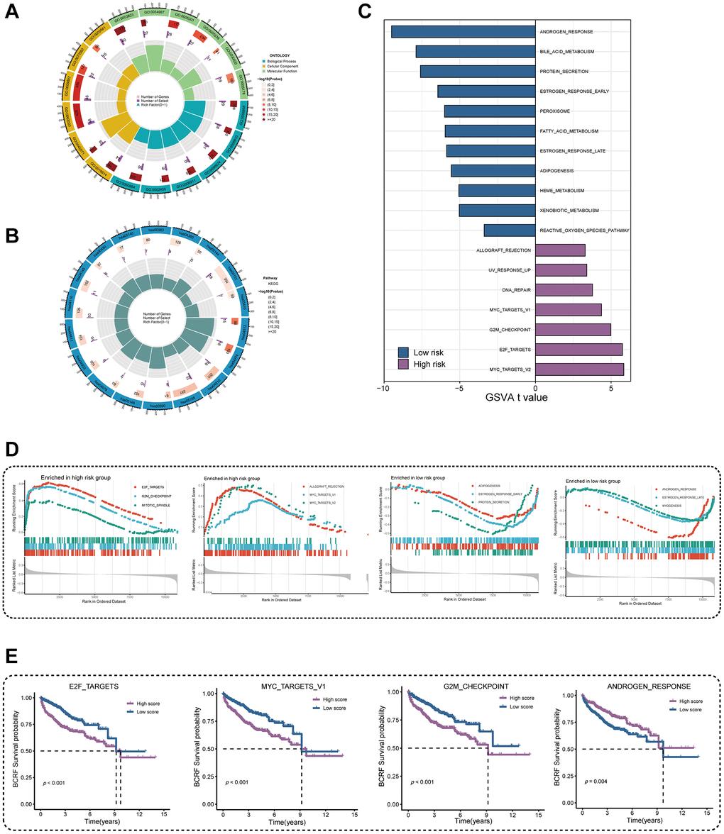 We performed GO and KEGG enrichment analyses in order to investigate the underlying mechanism of ERscore. The PI3K-Akt signaling pathway, the p53 signaling pathway, mitotic spindle assembly, chromosomal segregation, immunoglobulin receptor binding, and B cell receptor signaling pathways were all demonstrated to be associated with ERscore (Figure 5A, 5B). According to the above GO and KEGG items, ERscore may be related to immunological processes, tumor mutations, and carcinogenic pathways. Following the inclusion of 50 oncogenic signature pathways in GSVA, results revealed that 7 signature pathways considerably increased in high-risk patients whereas 11 pathways dramatically reduced in low-risk patients (Figure 5C). Seven genes were highly elevated in the high-risk group, according to GSEA analysis, whereas six genes were downregulated in the low-risk group (Figure 5D). Using the Kaplan-Meier approach to analyze the intersection-derived pathways, different BCRF survival probabilities for a number of well-known oncogenic pathways were found such as E2F_TARGETS, MYC_TARGETS_V1, G2M_CHECKPOINT, and ANDROGEN_RESPONSE (Figure 5E). This suggests that ERscore has a role in a variety of biological processes, particularly carcinogenic pathways in PRAD.