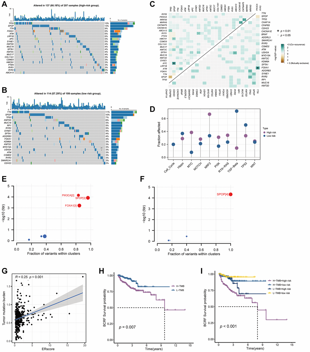 Waterfall plots were used to illustrate the genetic mutation landscape between high- and low-risk populations (Figure 6A, 6B). TP53, SPOP, TTN, FOXA1, and ATM were the top five most often mutant genes in the high-risk group, while TTN, SPOP, TP53, KMT2D, and MUC16 were the top five most frequently mutated genes in the low-risk group. Furthermore, we analyzed co-occurring or exclusive mutations in the top 25 mutated genes between the two cohorts, but no significant differences were observed (Figure 6C). The MYC, NRF, and PI3K signaling pathways were greatly enhanced while the TGF-Beta signaling pathway was dramatically decreased in the high-risk group, according to mutation enrichment of carcinogenic pathways (Figure 6D). In contrast to PIK3CA and FOXA1, which were exclusively enriched in the high-risk group, SPOP was shown to be enriched in both high- and low-risk populations in our research of carcinogenic genes (Figure 6E, 6F). This shows that PIK3CA and FOXA1 have a significant role in the development of ERS-related tumors. The relationship between ERscore and TMB is also favorable (Figure 6G, 6H). Survival analysis also showed that patients with high TMB and high risk scores were associated with poor prognosis (Figure 6I).