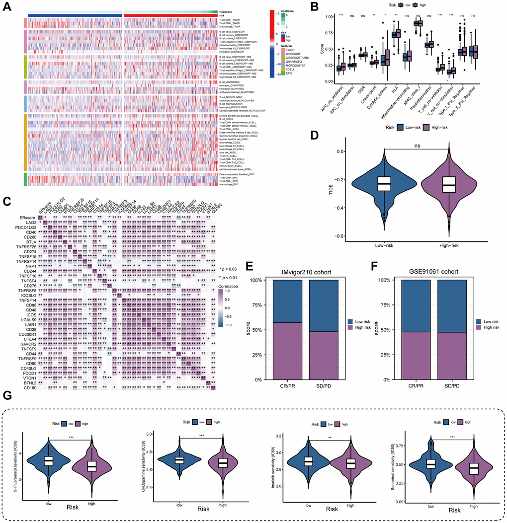 By examining the immune environment of the tumor, we found that the high-risk group had more immune cells, including T cells, B cells, NK cells, and macrophages infiltrating than the low-risk group (Figure 7A). Furthermore, most immune-related pathways were significantly elevated in the high-risk group, including immune checkpoints, cytolytic activity, HLA function, and T cell costimulation (Figure 7B). In addition, we found that immunosuppressive receptor expression was higher in patients at higher risk (PD-1, CTLA4, BTLA, and LAG3) as well as immunosuppressive ligands (LGALS9 and TNFSF14) (Figure 7C). Patients in high- and low-risk groups did not significantly differ in their responses to immunotherapy, according to the TIDE algorithm (Figure 7D). The anticipated outcomes from the GSE91061 cohort did not reveal this difference, despite the fact that patients with higher ERscores in the IMvigor210 cohort had a stronger anti-PD-1 response than patients with lower ERscores (Figure 7E, 7F). We assessed the chemotherapeutic response of PRAD patients with various ERscores in considering the fact that PRAD has poor response to immunotherapy. Our results demonstrate that various chemotherapeutic agents, including 5-fluorouracil, cyclopamine, imatinib, and salubrinal, have much lower IC50 values in high-risk individuals (Figure 7G).