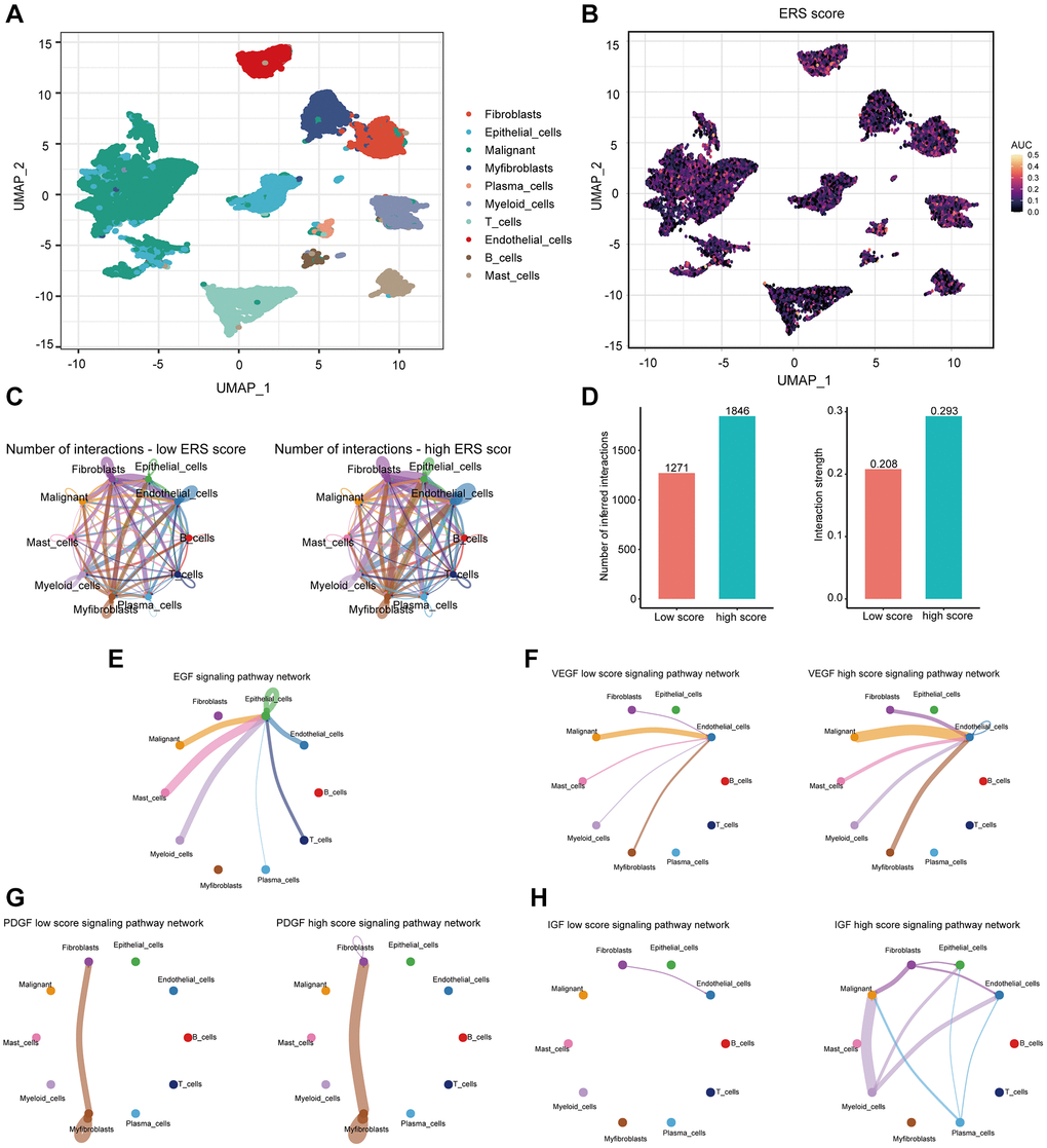 After sample preprocessing, the cells were clustered and annotated into 10 major clusters fibroblasts, epithelial cells, malignant cells, myofibroblasts, plasma cells, myeloid cells, T cells, endothelial cells, B cells, and mast cells (Figure 8A, Supplementary Figure 2). Subsequently, we divided all cells into high and low groups based on ERS-related AUC scores (Figure 8B). The high ERS score group showed enhanced intercellular interactions in number and strength based on ligand-receptor signaling (Figure 8C, 8D). Particularly, the high ERS score group exhibited elevated EGF, VEGF, PDGF, and IGF signaling pathways in comparison to the low ERS score group (Figure 8E–8H). Patients in the high ERS score group and the low ERS score group displayed different intercellular communication patterns, and the high ERS score group had considerably overexpressed carcinogenic pathways.