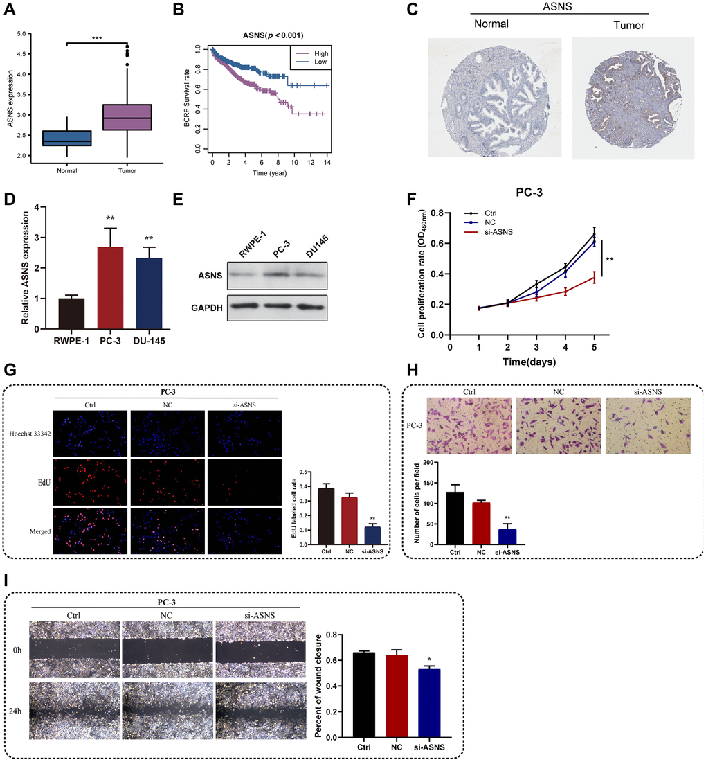Among the essential genes that make up the ERscore, ASNS was strongly associated with PRAD prognosis (Coef = 2.22). Therefore, we chose ASNS for further analysis. Firstly, TCGA investigation revealed that PRAD had much more ASNS expression than normal tissue, and that ASNS was linked to worse BCRF survival in PRAD patients (Figure 9A, 9B). Data from Human Protein Atlas https://www.proteinatlas.org/ revealed that ASNS protein expression was relatively higher in PRAD (Figure 9C). Subsequently, our in vitro experiments confirmed that the expression levels of ASNS in PC-3 and DU145 cells were significantly higher than those in RWPE-1 cells by qRT-PCR and Western blotting. (Figure 9D, 9E). To validate our predicted tumor-promoting role of ASNS in PRAD, we knocked down ASNS expression in PC-3 cells using siRNA and overexpressed ASNS in DU145 with the ov-ASNS vector (Supplementary Figure 3). The qRT-PCR tested the knockdown efficiency of si-ASNS, and the results prompted us to select si-ASNS sequence 2 for further experiments. Through the application of the CCK-8 and EdU assays, we discovered that suppressing ASNS expression can drastically slow PC-3 cells’ ability to divide and proliferate (Figure 9F, 9G). Additionally, we discovered that inhibiting ASNS dramatically reduced PC-3 cells’ capacity for migration and invasion using Transwell and invasion assays (Figure 9H, 9I). These findings suggest that ASNS may become a new target for patients with PRAD.