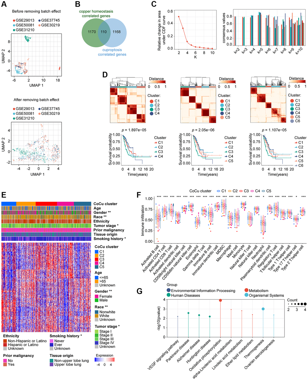 1280 copper homeostasis-correlated genes and 1278 cuproptosis-correlated genes were obtained, and a total of 110 genes were in their intersection (Figure 2B). An algorithm of consensus clustering classified training cohort LUADs into 2, 3, 4, 5, 6, 7, 8, 9, and 10 clusters, respectively, based on the 110 copper homeostasis/cuproptosis correlated genes. We observed the CDF plot for the downward trend of the curve, finding that when k = 4, 5, or 6 may potentially arouse our interest (Figure 2C). In addition, we examined the intragroup consistency of each group by checking the consensus values, and the results indicated that when k is 5, the clusters have the highest average consistency. When k is 4, the consistency of the cluster ranked the second highest (Figure 2C). Based on the evidence, we are more interested in the clustering situation when k = 4, 5, and 6. In Figure 2D upper parts, we plotted the clustering diagrams for k = 4, 5, and 6. It could be seen that when k = 5, the clustering was relatively neat and well gathered. Next, we constructed the KM curve for each k value (Figure 2D, lower parts), and found that the p value was smaller than the others’ when k = 5, which indicated that the survival difference was the most pronounced. We then take the cluster with k = 5 as our copper homeostasis/cuproptosis related (CoCu) cluster (Figure 2E). Furthermore, there were statistically significant differences in five CoCu clusters of LUAD patients in terms of clinical factors like gender, race, tumor stage, and smoking history (Figure 2E). The ssGSEA method was used to determine the infiltration levels of various immune cell populations in the five CoCu clusters. Figure 2F illustrates that the distribution of all 23 types of immune cells across the clusters differed significantly from a statistical perspective. By comparing the five CoCu clusters, we carried out an analysis to find differentially expressed genes and identified 72 CoCu-DEGs (Supplementary Table 2). The KEGG was performed using these 72 CoCu-DEGs and demonstrated the top ten pathways related to the CoCu cluster, which were VEGF signaling pathway, Parkinson disease, Alzheimer disease, Huntington disease, oxidative phosphorylation, alpha-Linolenic acid metabolism, linoleic acid metabolism, ether lipid metabolism, thermogenesis, and ovarian steroidogenesis (Figure 2G).