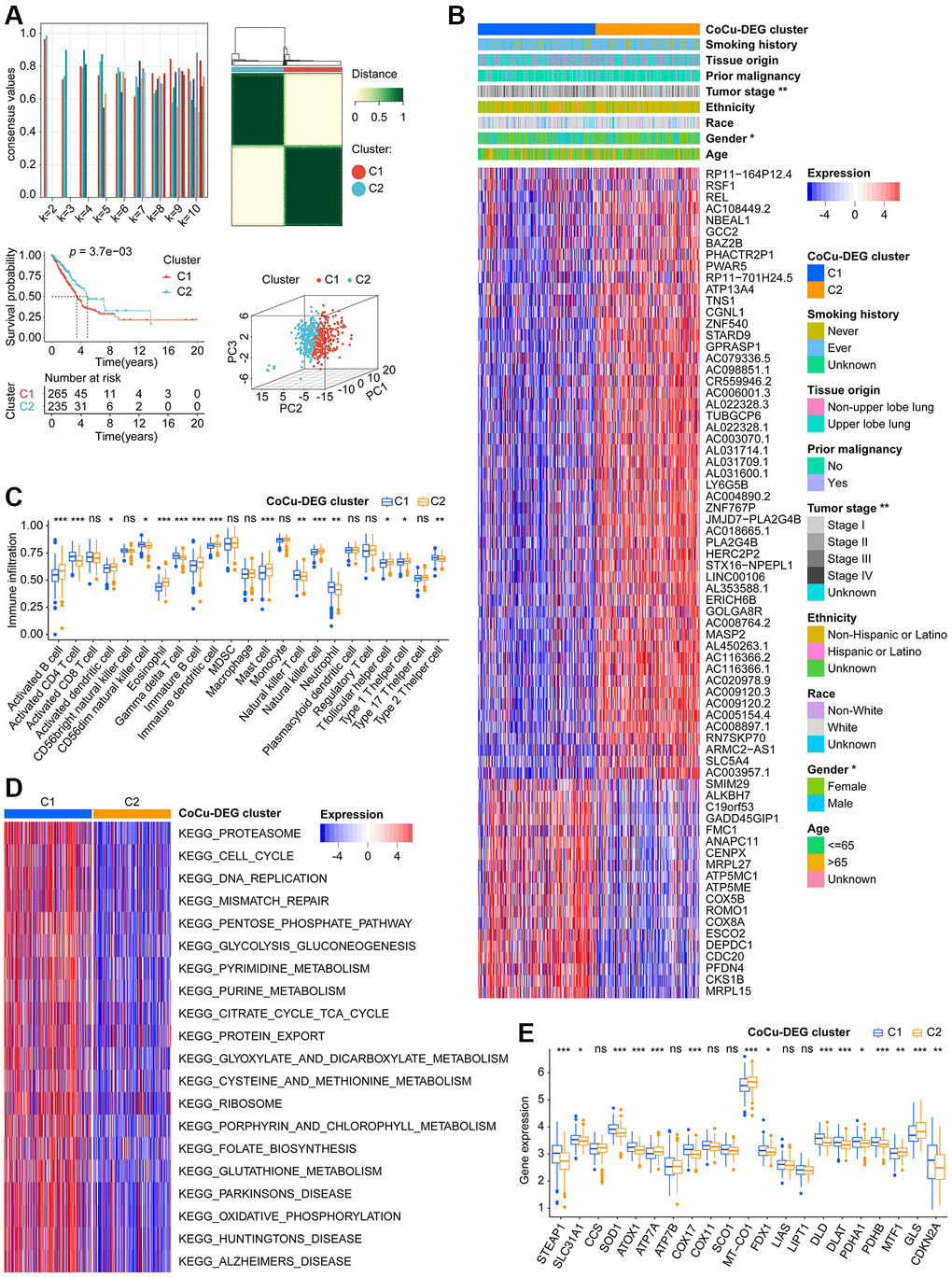 Using CoCu-DEG as a basis, we attempted to classify the training cohort LUADs into 2, 3, 4, 5, 6, 7, 8, 9, and 10 clusters, respectively (Figure 3A, upper-left). We examined the intragroup consistency of each group by checking the consensus values, and the results indicated that when k is 2, the clusters have the highest average consistency (Figure 3A, upper-left). We plotted the clustering diagram for k = 2, showing the clustering was relatively neat and well gathered (Figure 3A, upper-right). Next, we constructed the KM curve for k = 2 cluster, finding that the survival difference in clusters was statistically significant (Figure 3A, lower-left). Based on the results of PCA, it was observed that clusters C1 and C2 were distinctly separated from each other (Figure 3A, bottom right). Considering these pieces of evidence, we propose that the clusters at k = 2, namely the CoCu-DEG clusters (Figure 3B), can be the focus of our study. Notably, the analysis revealed that LUAD patients in the CoCu-DEG cluster exhibited significant differences in terms of gender and tumor stage (Figure 3B). Further, by utilizing ssGSEA, we were able to determine the extent of infiltration of various types of immune cells within the CoCu-DEG clusters. Figure 3C depicted that among the CoCu-DEG clusters, 15 distinct immune cells, namely Activated B cell, Activated CD4 T cell, Activated dendritic cell, CD56dim natural killer cell, Eosinophil, Gamma delta T cell, Immature B cell, Immature dendritic cell, Mast cell, Natural killer T cell, Natural killer cell, Neutrophil, T follicular helper cell, Type 1 T helper cell, and Type 2 T helper cell, were significantly distributed. To identify the key KEGG pathways between the CoCu-DEG clusters, we conducted GSVA (Figure 3D, Supplementary Table 3). Surprisingly, KEGG_PROTEASOME, KEGG_DNA_REPLICATION, KEGG_PARKINSONS_DISEASE, KEGG_OXIDATIVE_PHOSPHORYLATION, KEGG_CELL_CYCLE, KEGG_PENTOSE_PHOSPHATE_PATHWAY, KEGG_HUNTINGTONS_DISEASE, KEGG_PYRIMIDINE_METABOLISM, KEGG_ALZHEIMERS_DISEASE, and KEGG_PORPHYRIN_AND_CHLOROPHYLL_METABOLISM ranked as the top 10 pathways. Notably, we looked at the distribution of 21 copper homeostasis/cuproptosis-regulated genes across CoCu-DEG clusters and found 15 genes (STEAP1, SLC31A1, SOD1, ATOX1, ATP7A, COX17, MT-CO1, FDX1, DLD, DLAT, PDHA1, PDHB, MTF1, GLS, and CDKN2A) were related to the clusters (Figure 3E).