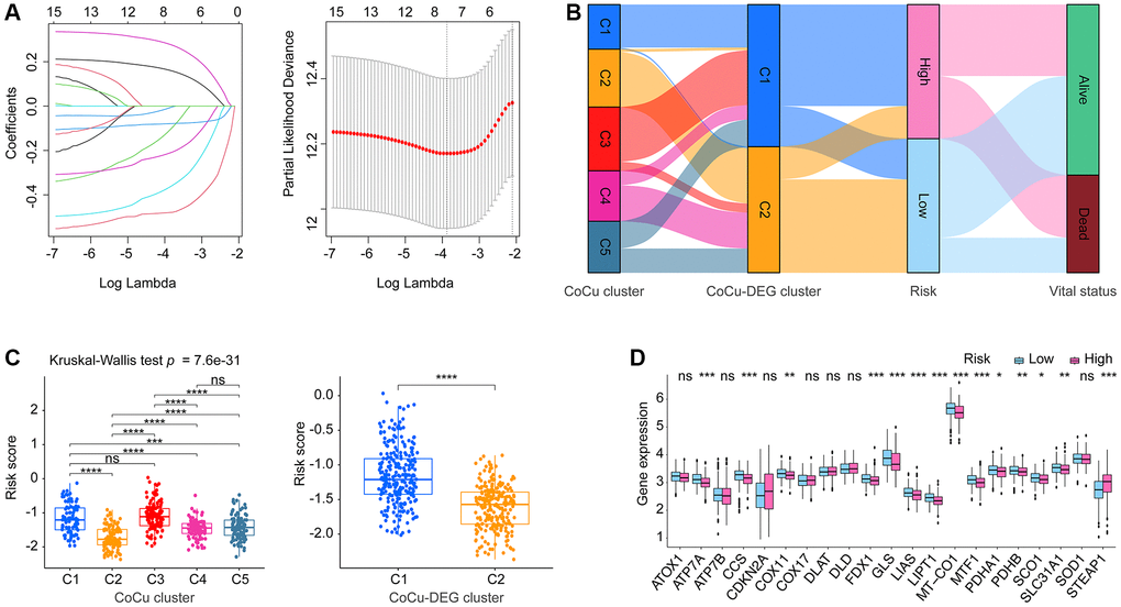 We categorized patients in the training cohort based on CoCu-DEGs and generated KM curves to evaluate survival disparities across the CoCu-DEG clusters. To assess the level of differentiation among the different clusters, we utilized principal component analysis (PCA) by using “scatterplot3d” package in R. Then we conducted the ssGSEA and generated visualizations. Next, we employed the “limma”, “GSEABase”, “GSVA”, and “pheatmap” R packages to perform GSVA to identify the top significant KEGG pathways among the CoCu-DEG clusters. We observed the distribution of 21 copper homeostasis/cuproptosis-regulated genes (STEAP1, SLC31A1, CCS, SOD1, ATOX1, ATP7A, ATP7B, COX17, COX11, SCO1, MT-CO1, FDX1, LIAS, PDHA1, PDHB, MTF1, LIPT1, DLD, DLAT, GLS, and CDKN2A) across CoCu-DEG clusters using boxplot. We explored the lncRNA that were differentially expressed between the CoCu-DEG clusters (DELs) with an FDR threshold of less than 0.05. Subsequently, we conducted univariate Cox and KM analyses on DELs to identify the ones that showed potential prognostic significance with a p-value of less than 0.05. The CoCuLncSig was constructed using prognostic DELs and a least absolute shrinkage and selection operator (LASSO) to prevent overfitting. The “glmnet” R package was used to ascertain the model, with the penalty parameter (λ) corresponding to the partial likelihood deviance and tested using tenfold cross-validation. The R package outputted the composition of the CoCuLncSig and the coefficient of each lncRNA. The risk score was calculated by summing the expression level of each lncRNA in the CoCuLncSig multiplied by its corresponding coefficient.