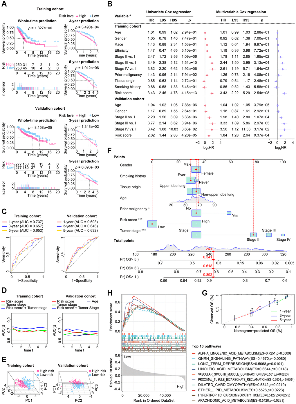The fundamental performance of our CoCuLncSig in both the training and validation cohorts is demonstrated in Supplementary Figure 1B, 1C, respectively. In our analysis of KM, we made survival predictions for whole-time, 3-year, and 5-year periods. The results indicated that both the high-risk LUADs in the training cohort (Figure 5A, upper) and those in the validation cohort (Figure 5A, lower) had a worse prognosis than those in the low-risk groups. Additionally, the KM curve presented in Supplementary Figure 2A of the supplementary material illustrates the prognostic ability of each CoCuLncSig lncRNA in the two cohorts. This curve reveals that ITGB1-DT and LINC01833 were associated with a worse prognosis for LUADs, while AL691432.2, AC093010.2, AC107464.3, AC025278.1, COLCA1, and AC026471.3 were associated with improved outcomes in LUADs. Our analysis then determined whether the risk score was a reliable predictor of outcomes for LUAD patients, independent of clinical parameters such as age, gender, race, ethnicity, tumor stage, tumor origin, etc. To this end, univariate and multivariable analyses were performed, as illustrated in Figure 5B. The risk scores displayed significant prognostic ability (p ≤ 4.20e-05) in univariate Cox regression analysis for both the training and validation cohorts. In the training cohort, the risk score had a hazard ratio of 3.43 (95% CI: 2.22–5.29, p = 2.54e-08) in multivariate Cox analysis, while in the validation cohort, the risk score had a hazard ratio of 1.84 (95% CI: 1.28-2.64, p = 9.37e-04). These results indicate that the risk score performed well in both cohorts and can be considered an independent prognostic factor. Interestingly, while the ‘age’ factor showed independent prognostic power in the validation cohort, it did not have any independent predictive power in the training cohort. In Supplementary Figure 2B of the supplementary material, we have provided an analysis of the results and visualization for each CoCuLncSig lncRNA using univariate Cox regression. ROC analysis (Figure 5C) and tAUC (Figure 5D) were utilized to evaluate the accuracy of the model. The CoCuLncSig AUC in the training cohort was determined to be 0.737, 0.657, and 0.652 at one year, three years, and five years, respectively, as indicated by the ROC curves. In the validation cohort, the AUC was found to be 0.693, 0.646, and 0.632 at one year, three years, and five years, respectively. The CoCuLncSig model’s accuracy was continuously assessed using tAUC. In the training cohort (Figure 5D, left), our risk score was found to be in close proximity to the tumor stage, as determined by tAUC. This was also observed in the validation cohort (Figure 5D, right), where the model’s tAUC was also comparable to the tumor stage, which has been regarded as the gold standard for prognosis prediction. Remarkably, when we combined our risk score with the tumor stage for tAUC, the predictive AUC of the combination was consistently above 0.7 in the training cohort (Figure 5D, left) and outperformed other factors at all time points in the validation cohort (Figure 5D, right). These findings indicate that our CoCuLncSig risk score’s accuracy is comparable to that of the tumor stage and an excellent complement to it. Figure 5E of the study showed that there was significant heterogeneity between high-risk and low-risk patients in the study cohorts based on the results of PCA. This suggests that the risk score model is effective in distinguishing these two groups. Furthermore, a nomogram (Figure 5F) was developed using clinical parameters such as age, tumor stage, gender, smoking history, tissue origin, prior malignancy, and risk score. This nomogram has the potential to assist in determining the 1-year, 3-year, and 5-year prognosis status of clinical patients. The predictive accuracy of the nomogram was confirmed by the calibration curve (Figure 5G). The GSEA analysis demonstrated the most vital ten CoCuLncSig related KEGG pathways were related to alpha-Linolenic acid metabolism, gonadotropin-releasing hormone signaling pathway, long-term depression, linoleic acid metabolism, vascular smooth muscle contraction, proximal tubule bicarbonate reclamation, dilated cardiomyopathy, ether lipid metabolism, hypertrophic cardiomyopathy, and arachidonic acid metabolism (Figure 5H).