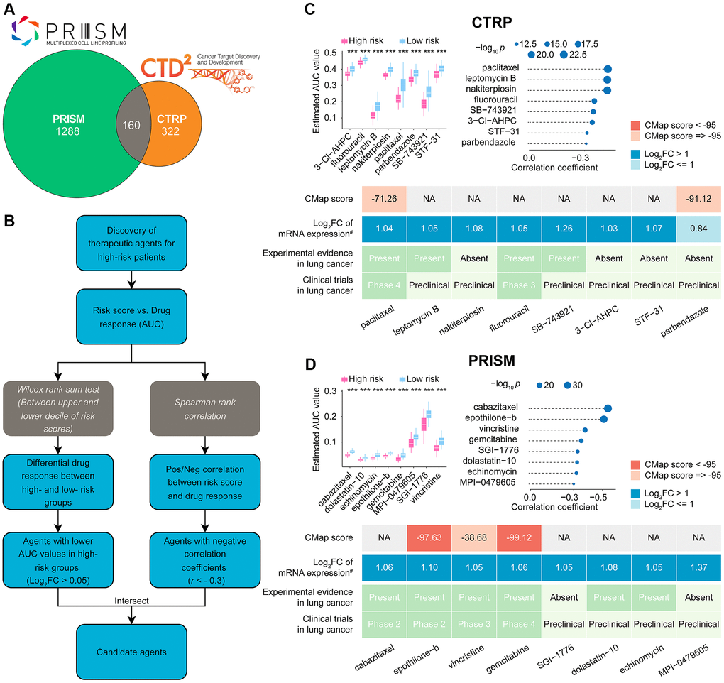 After removing duplicate entries, the combined CTRP and PRISM datasets comprised 1770 unique compounds. One hundred sixty compounds were common to both datasets, as depicted in Figure 8A and summarized in Supplementary Table 8. By utilizing both CTRP and PRISM data, we integrated two distinct methodologies to pinpoint potential therapeutic agents for LUADs with elevated risk scores (Figure 8B). These approaches produced eight CTRP-derived agents (including paclitaxel, leptomycin B, nakiterpiosin, fluorouracil, SB-743921, 3-Cl-AHPC, STF-31, and parbendazole) (Figure 8C, upper) and eight PRISM-derived compounds (including cabazitaxel, epothilone-b, vincristine, gemcitabine, SGI-1776, dolastatin-10, echinomycin, and MPI-0479605) (Figure 8D, upper).