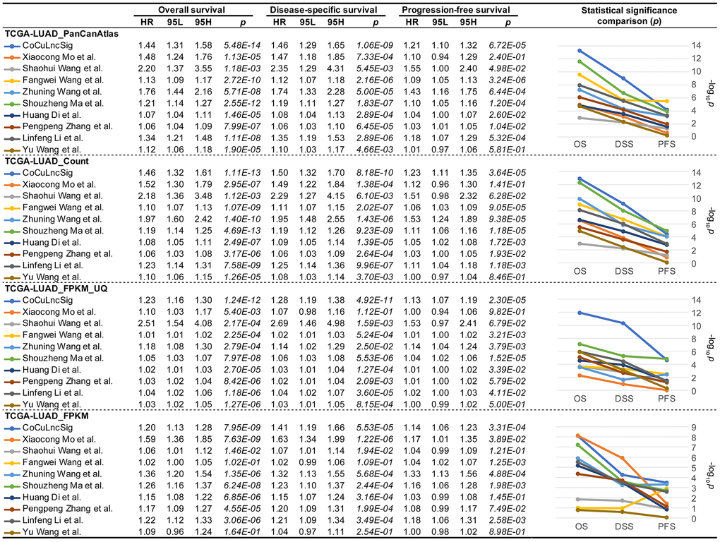 In order to conclude whether our study is more robust than previous, we searched PubMed and initially eleven studies [37–47] were found (Table 3). However, Wei Ye et al. and Ran Chen et al. ‘s study did not provide the coefficient details of their signatures, which were excluded from our choices. Finally, nine studies [37–40, 42, 43, 45–47] were listed as candidates for comparison with our signature (Table 3). To compare previous signatures with ours, we performed Cox regression analysis for overall, disease-specific, and progression-free survival using four formats of official TCGA data (Figure 9), respectively. The analysis confirmed that CoCuLncSig has solid predictive ability in overall, disease-specific, and progression-free survival in four testing cohorts (p < 3.31e-04) (Figure 9). In particular, our signature occupies the first place in terms of p value in overall survival and disease-specific survival analysis of TCGA-LUAD_PanCanAtlas, TCGA-LUAD_Count, and TCGA-LUAD_FPKM_UQ, and progression-free survival analysis of TCGA-LUAD_FPKM (Figure 9). CoCuLncSig ranked 2nd in terms of p value in progression-free survival analysis of TCGA-LUAD_PanCanAtlas, TCGA-LUAD_Count, and TCGA-LUAD_FPKM_UQ, and overall survival and disease-specific survival analysis of TCGA-LUAD_FPKM (Figure 9). It’s worth noting that our signature didn’t rank third or worse in the comparisons. From the statistical significance comparison plots (Figure 9, right), we can see that the study that closest to our signature is from Shouzheng Ma et al., but they only ranked first in the progression-free survival analysis of TCGA-LUAD_Count and TCGA-LUAD_FPKM_UQ with a slight advantage, and in other comparisons in a later position.