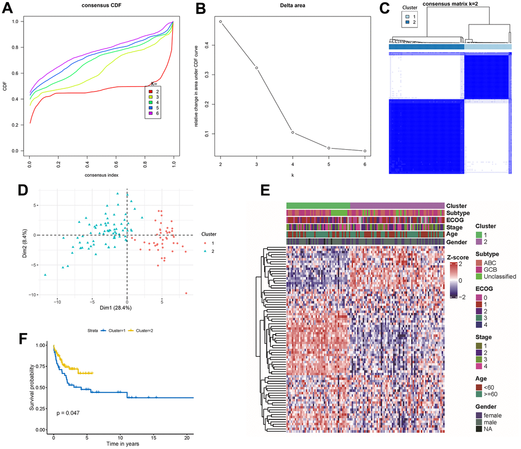 Unsupervised machine learning was performed using ConsensusClusterPlus R package (v1.36.0) [21] to identify autophagy-based molecular subclasses of DLBCL, with a maximum cluster number set to 6. The optimal cluster number was determined by evaluating the consensus matrix heatmaps and cluster-consensus values [22]. The preferred number of clusters was selected based on the criteria of achieving the clearest heatmap and highest cluster-consensus values, indicating higher stability within the clusters. The cumulative distribution function (CDF) of the consensus matrix for κ clusters is a more quantitative measure of cluster coherence. Then a delta area plot was produced to display the amount of change in area under the CDF between κ and κ + 1 clusters.