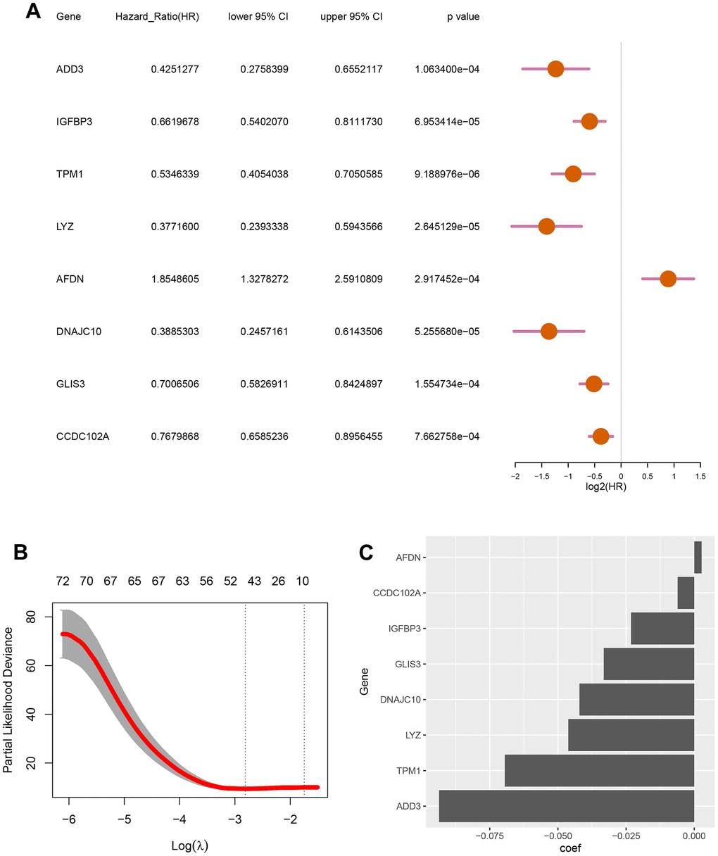 To develop a autophagy-based prognostic model for DLBCL patients, 78 genes with a P-value less than 0.002 from the previous univariate Cox regression analysis were subjected to LASSO regression. This identified eight autophagy-related genes to construct the prognostic model (Figure 2A). The optimum lambda value was confirmed as shown in Figure 2B. The coefficient distribution of the eight genes was presented in Figure 2C. Riskscore formula was as follows, Riskscore = 0.0027*E(AFDN)-0.0936*E(ADD3)-0.0232*E(TPM1)-0.0462*E(LYZ)-0.0421*E(DNAJC10)-0.0332*E(GLIS3)-0.0061*E(CCDC102A)-0.0232*E(IGFBP3). Where E indicates the expression level of the corresponding gene.