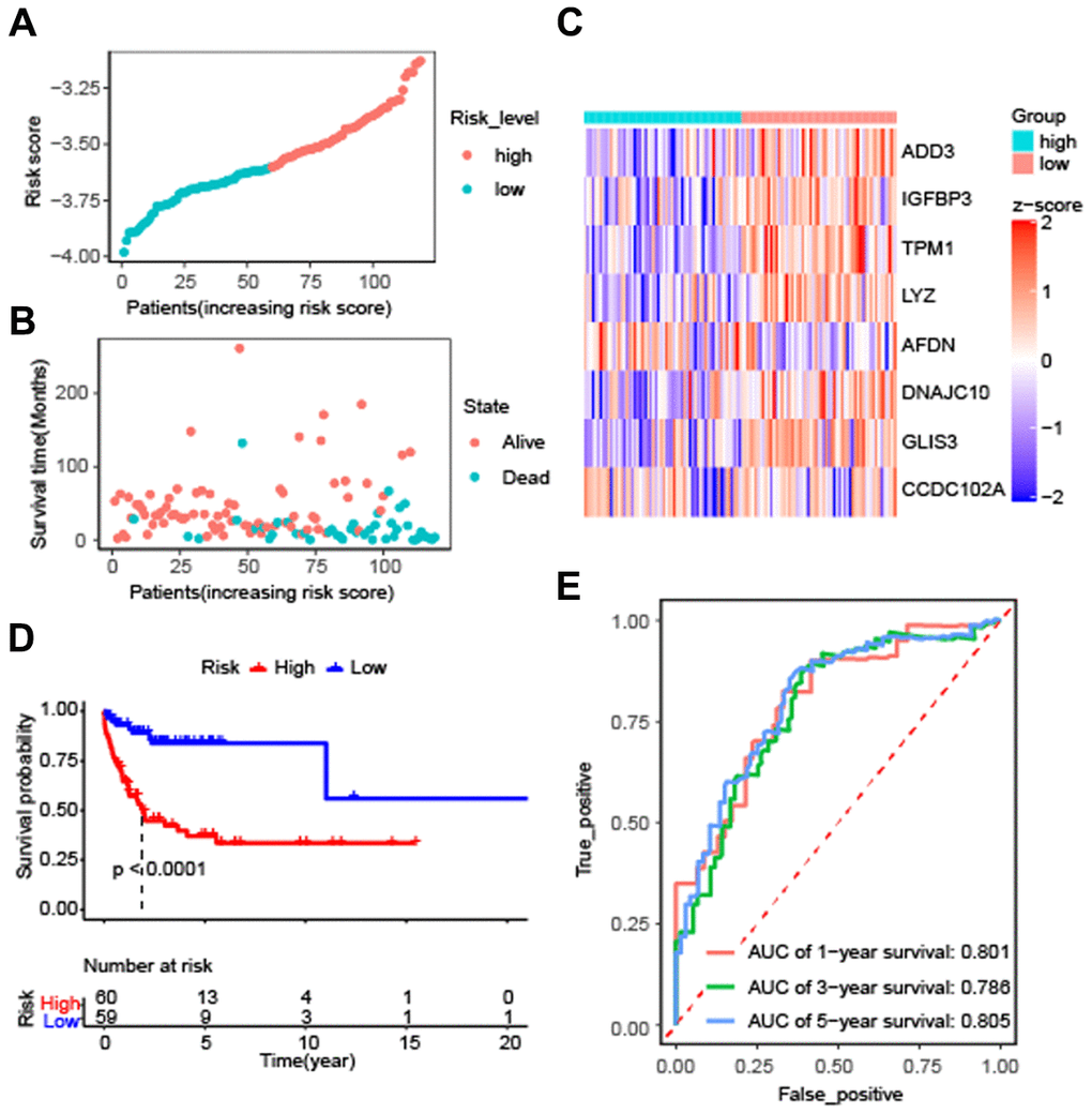 To evaluate the effectiveness of the constructed model, the risk score and survival time distributions of the patients were analyzed. All patients were divided into high-risk and low-risk groups based on the median value of Riskscore, with those exceeding the median classified as high-risk and those below as low-risk (Figure 3A). The survival data-time plot is shown in Figure 3B, which indicates that deceased patients generally have higher risk scores. Moreover, patients with high risk were detected with low expression of ADD3, IGFBP3, TPM1, LYZ, AFDN, DNAJC10, GLIS3, and CCDC102A (Figure 3C). Kaplan-Meier survival curves presented that the patients with high risks exhibited significantly low survival probability (P < 0.0001) (Figure 3D). ROC curves were plotted and AUC scores of 1-year, 3-year, and 5-year survival were 0.801, 0.786, and 0.805, respectively (Figure 3E). These results implied that the risk prediction model based on autophagy-related genes can differentiate the prognosis of patients with DLBCL to a certain degree.