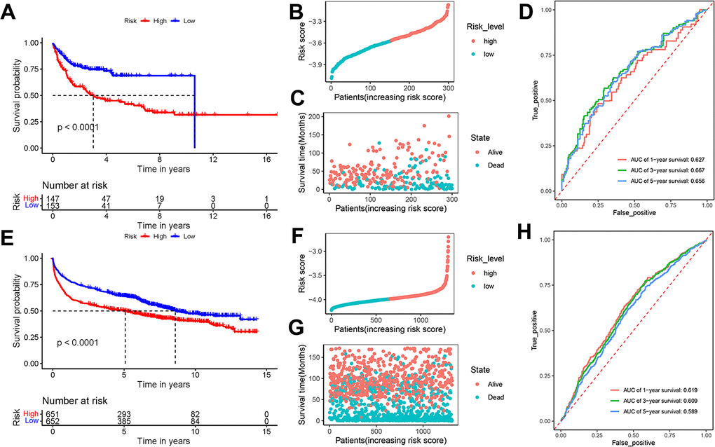 To validate the universality and reliability of our model, we conducted evaluations using two separate validation datasets. The Kaplan-Meier survival analysis revealed that patients in the high-risk group had a lower survival probability than those in the low-risk group (P < 0.0001) (Figure 4A). Figure 4B presented the risk score distribution of 300 DLBCL patients in GSE10846 dataset. The survival time distribution showed that the patients in the alive status were predicted with low-risk scores and a long survival time (Figure 4C). AUC scores of 1-year, 3-year, and 5-year survival were 0.627, 0.667, and 0.656 in dataset GSE10846, respectively (Figure 4D). Analysis of GSE181063 dataset confirmed that patients with high-risk scores obviously had decreased survival probability (P < 0.0001) (Figure 4E). The risk score distribution of 1303 patients was shown in Figure 4F. Figure 4G confirmed the strong association between risk scores and survival time. For the GSE181063 dataset, AUC scores of 1-year, 3-year, and 5-year survival were 0.619, 0.609, and 0.589 respectively, as shown in Figure 4H. Considering the evidence from both datasets, we infer that our established model provides effective predictive insights for DLBCL patient outcomes.