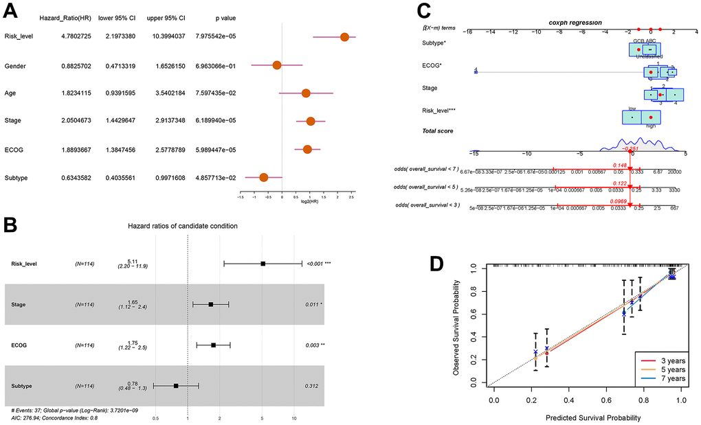 With the aim of enhancing the prediction and clinical utility for DLBCL prognosis, we constructed a nomogram incorporating both the autophagy-related prognostic model and clinical characteristics. Univariate analysis confirmed 4 significant prognostic factors, including risk level, stage, ECOG score, and molecular subtype (Figure 5A). Further multivariate Cox regression analysis screened the significant factors including risk level, stage, ECOG score, and molecular subtype (Figure 5B), which were then incorporated into the nomogram. Figure 5C showed the prognostic nomogram and odds values of overall survival at 3, 5, and 7 years. The calibration plot for 3-year, 5-year, and 7-year overall survival exhibited an optimal agreement between the observed outcomes and predictions by nomogram (Figure 5D). In summary, the nomogram seamlessly integrates multiple risk factors to offer individualized and precise prognostic predictions for DLBCL patients, enhancing its applicability in clinical settings.
