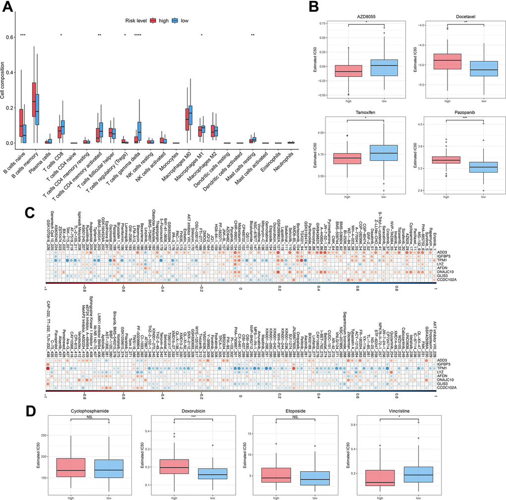 DLBCL patients were divided into high-risk and low-risk groups based on the established prognostic model. For immune infiltration analysis, R-cibersort package (v1.03) [26] was used to analyze the proportion of immune cells, employing the LM22 gene signature which can be accessed at https://cibersortx.stanford.edu/. Chemotherapeutic drug resistance of DLBCL patients was calculated using the pRRophetic package (v0.5) [27], with drugs retrieved from the cpg2016, encompassing a total of 237 drugs. The prediction of drug effectiveness was carried out using R-oncoPredict package (v0.2) [28], referencing two drug response datasets from the GDSC databases, including the GDSC1 dataset which contained 367 compounds and the GDSC2 dataset which contained 198 compounds, as of March 8, 2022. The differences in drug effectiveness between the two groups were compared by two-sided student’s t-test.