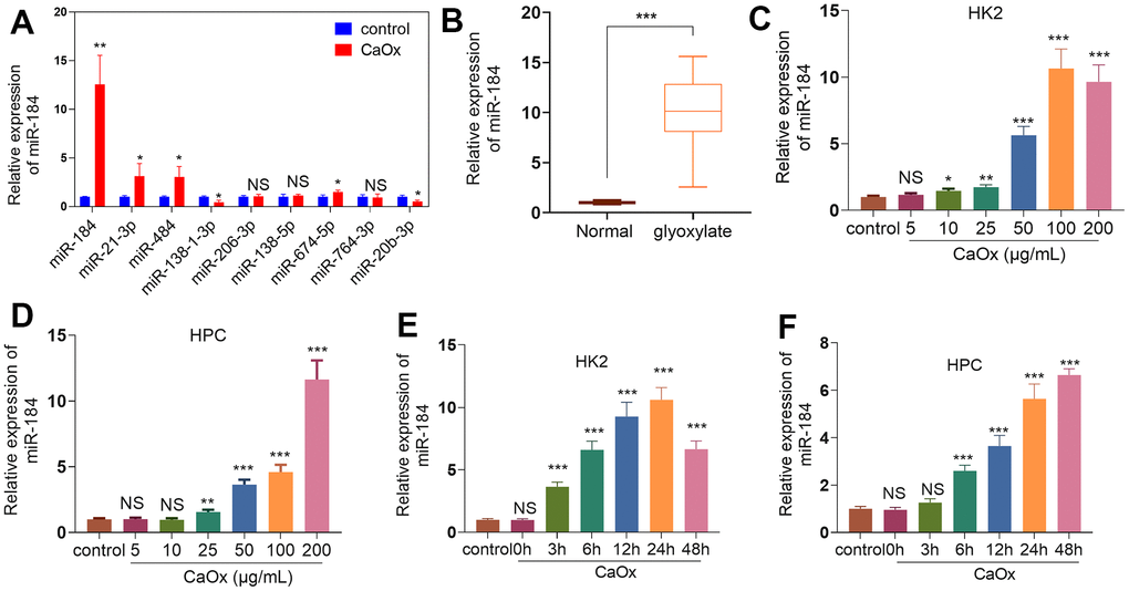 Differentially expressed miRNAs in genetic hypercalciuric stone-forming (GHS) rats compared to normal rats from the public Gene Expression Omnibus (GEO) database (GSE75541) were analyzed (Table 1). We tested those 10 miRNAs in HK2 cells dealt with CaOx (100 μg/mL). MiR-184 was significantly altered and had the highest fold changes (Figure 1A). In contrast to the normal group, glyoxylate substantially elevated miR-184 expression in the rats’ kidney tissues (Figure 1B). CaOx (10, 25, 50, 100, and 200 μg/mL) considerably enhanced the miR-184 profile in HK2 and HPC cells vis-a-vis the control group (Figure 1C, 1D). Moreover, CaOx also enhanced miR-184 level in a time-dependent manner (Figure 1E, 1F). These findings signified that miR-184 expression was upregulated in both in vivo and in vitro renal calcinosis models.