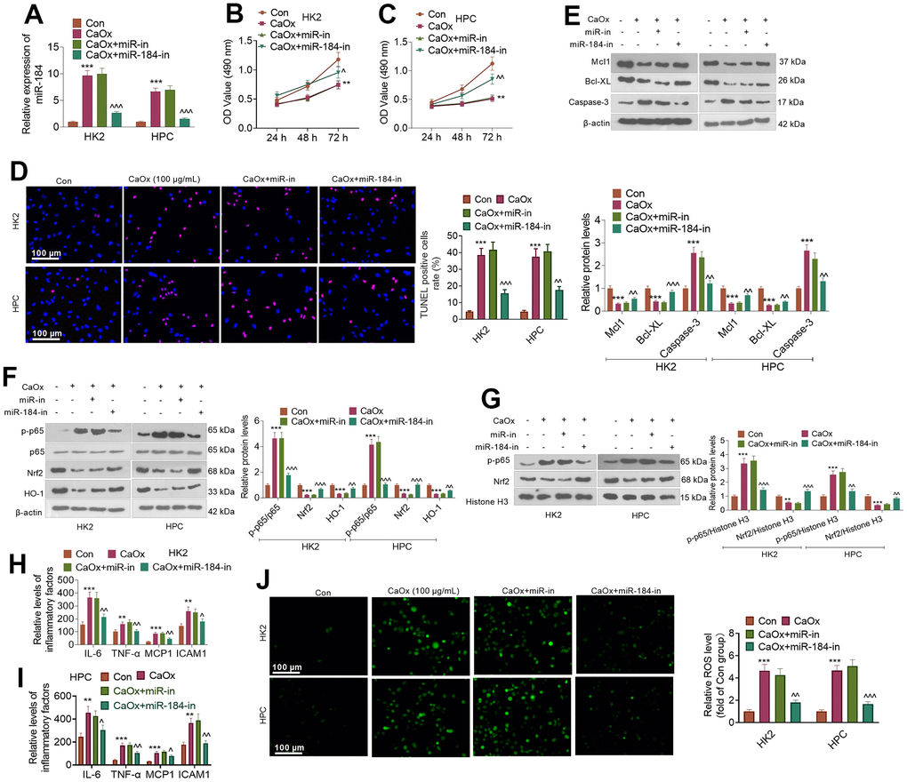CaOx (100 μg/mL) was applied to treat HK2 and HPC cells treated or untreated with miR-184-in. qRT-PCR indicated that in contrast with the Con group, CaOx prominently bolstered miR-184 expression in HK2 and HPC cells. When compared to the CaOx+miR-in group, miR-184-in transfection evidently reduced the profile of miR-184 (Figure 2A). As indicated by CCK8 assay, CaOx substantially weakened HK2 and HPC viability. When miR-184-in was further transfected, the cell viability was distinctly strengthened (Figure 2B, 2C). TUNEL staining showed that CaOx considerably augmented the proportion of TUNEL-positive HK2 and HPC cells, which was suppressed by miR-184-in (Figure 2D). Western blot analysis ascertained the protein profiles of apoptosis-correlated proteins (Mcl1, Bcl-XL, and Caspase-3,) and of the NF-κB and Nrf2/HO-1 pathways. As shown in Figure 2E, CaOx vigorously repressed the profiles of the anti-apoptosis proteins Mcl1 and Bcl-XL and boosted the protein profiles of the pro-apoptosis protein Caspase-3, but miR-184-in notably reversed this effect. Figure 2F shows that after HK2 cells and HPCs were treated with CaOx, the protein levels of p-p65/p65, Nrf2, and HO-1 were markedly increased. Nevertheless, miR-184-in was transfected on the basis of CaOx, resulting in a marked reduction in their protein profiles. Figure 2G shows that miR-184-in apparently weakened the CaOx-mediated promotion of p-p65 and Nrf2. Given the ELISA results, the levels of the inflammatory factors IL-6, TNF-α, MCP1, and ICAM1 in HK2 cells and HPCs were considerably increased by CaOx (compared with those in the Con group) but markedly decreased by miR-184-in (compared with those in the CaOx+miR-in group) (Figure 2H, 2I). Immunofluorescence indicated that miR-184 inhibited the promoting effect of CaOx on ROS activity (Figure 2J). These discoveries demonstrated that miR-184 knockdown exerted an inhibitory impact on renal cell damage mediated by CaOx.