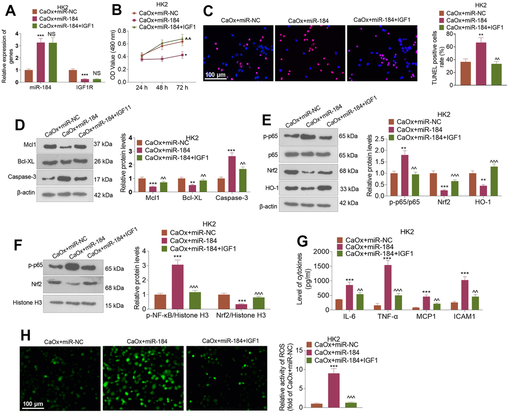 CaOx (100 μg/mL) and/or IGF1 (100 ng/ml) was utilized to treat HK2 cells transfected with miR-184 mimics. qRT-PCR indicated that in contrast to the CaOx+miR-NC group, miR-184 overexpression evidently suppressed IGF1R expression, whereas IGF1 treatment (compared to the CaOx+miR-184 group) did not substantially influence miR-184 expression (Figure 6A). CCK8 assay showed that miR-184 overexpression distinctly hindered HK2 cell viability, whereas IGF1 treatment enhanced their proliferation (Figure 6B). TUNEL staining evaluated HK2 cell apoptosis, signifying that miR-184 overexpression apparently bolstered HK2 cell apoptosis, while IGF1 treatment contributed to the opposite outcome (Figure 6C). As denoted by Western blot, miR-184 overexpression resulted in a decrease in the profiles of the anti-apoptotic proteins Mcl1 and Bcl-XL and an increase in the profiles of the pro-apoptotic proteins Caspase-3 and Caspase-8. When IGF1 treatment was performed, Mcl1 and Bcl-XL expression increased, while Caspase-3 expression decreased (Figure 6D). As presented in Figure 6E, 6F, IGF1 treatment substantially weakened the promoting function of miR-184 overexpression in the p-NF-κB p65 and Nrf2/HO-1 pathways. ELISA revealed that miR-184 overexpression dramatically enhanced the levels of the inflammatory cytokines IL-6, TNF-α, MCP1, and ICAM1, while IGF1 treatment gave rise to the reverse phenomenon (Figure 6G). Immunofluorescence showed that IGF1 treatment considerably dampened the promoting impact of miR-184 overexpression on ROS activity (Figure 6H). These findings revealed that IGF1 treatment abated miR-184-mediated damage-promotive function in renal cells.