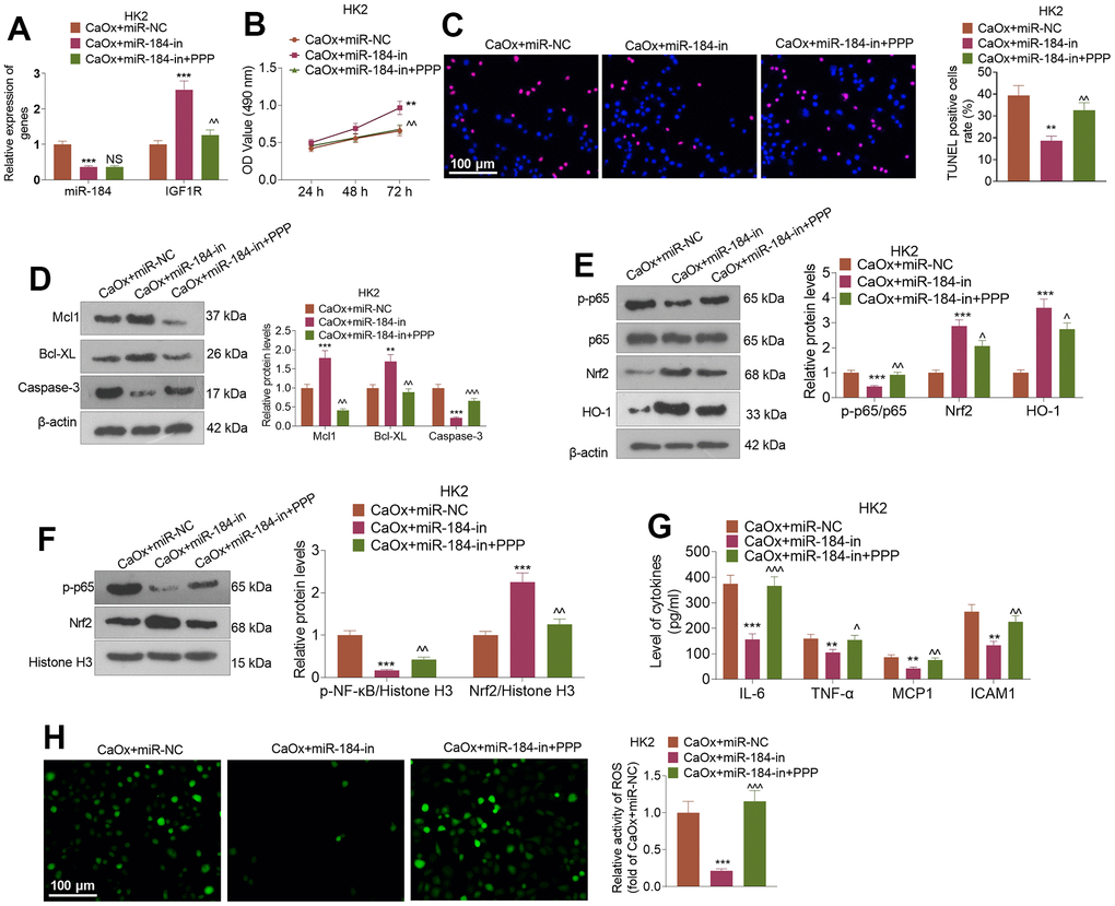 CaOx (100 μg/mL) was applied to treat HK2 cells following the transfection of miR-184-in and intervention with the IGF1R pathway inhibitor (PPP). Figure 7A shows that in contrast with the CaOx+miR-in group, miR-184-in transfection vigorously restrained miR-184 expression and bolstered IGF1R expression. In comparison with the CaOx+miR-184-in group, the use of PPP led to no considerable change in the profile of miR-184 but a stark reduction in that of IGF1R. The CCK8 assay and TUNEL assay revealed that PPP notably repressed HK2 cell viability and boosted cell apoptosis (Figure 7B, 7C). Western blot analysis revealed that PPP administration caused a rise in the levels of Mcl1 and Bcl-XL and a decline in the protein levels of the p-NF-κB and Nrf2/HO-1 pathways (Figure 7D–7F). As suggested by ELISA, PPP remarkably abated the inhibitory effect of miR-184-in on inflammatory factors (IL-6, TNF-α, MCP1, and ICAM1) (Figure 7G). Figure 7H shows that PPP apparently blocked the activity of ROS in HK2 cells.