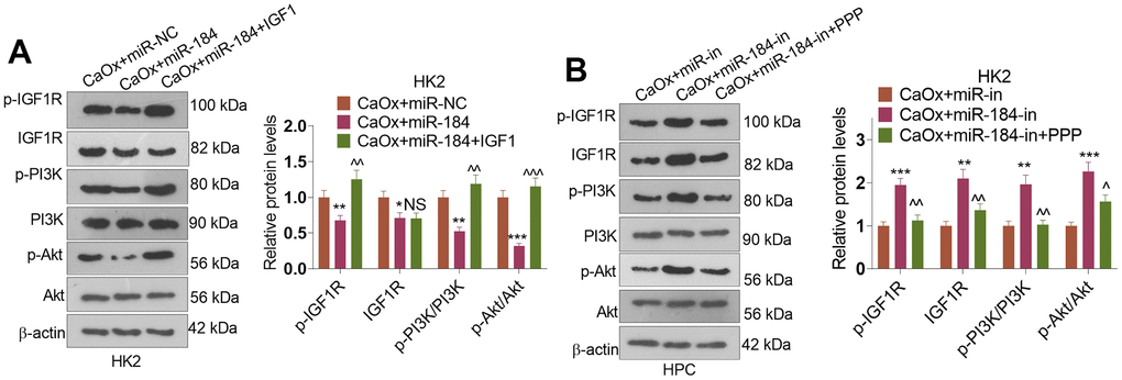 Western blot was conducted to evaluate IGF1R and PI3K-Akt pathway. These phenomena confirmed that miR-184 mimics repressed p-IGF1R, IGF1R, p-PI3K, and p-Akt in HK2 cells (compared with CaOx+miR-NC group, Figure 8A), while miR-184 inhibition enhanced p-IGF1R, IGF1R, p-PI3K, and p-Akt levels in HK2 cells (Figure 8B). Following IGF1 treatment, p-IGF1R, p-PI3K, and p-Akt levels were al elevated. By contrast, PPP suppressed p-IGF1R, IGF1R, p-PI3K, and p-Akt levels (Figure 8B). Thus, the Rap1 pathway was involved in miR-184-mediated renal cell damage.
