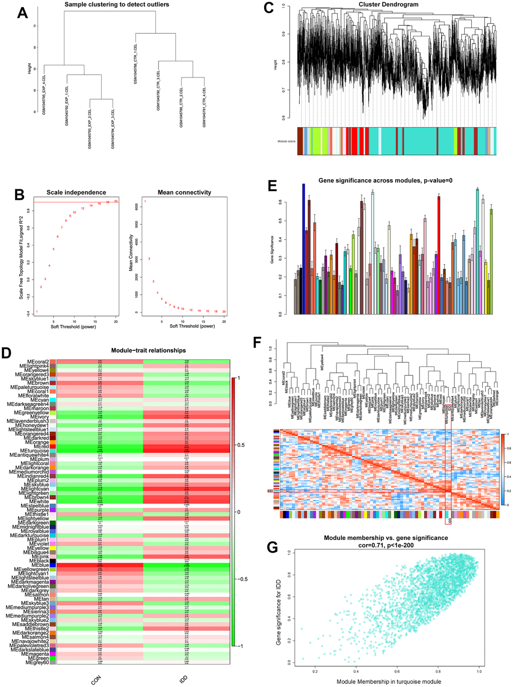 WGCNA analysis was performed to identify corresponding expression modules. All genes of the NP tissues were from GSE42611, totally 18870 genes were included for network establishment to get the comprehensive results. The outliers from NP tissues were detected and eliminated by hierarchical samples clustering for sample quality control, and the outlier of samples was 0, that meant all samples could be included for WGCNA workflow. Soft threshold power was calculated to construct WGCNA network. After the co-expression network was established, gene patterns in each module were identified to cluster the similar genes together. The correlations between clinical traits (IDD) and the identified module were analyzed to screen the interested module. Eigenvalues of each module as well as the clinical trait (IDD) was also calculated to cluster the similar objects together. Among the above analysis, the most significant module was determined as the interested module for subsequent research.