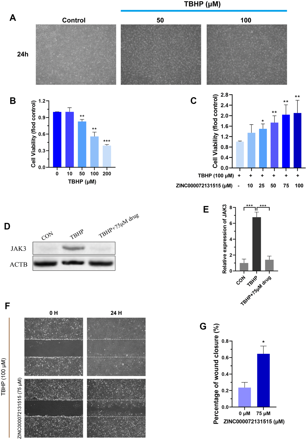 After 100μM TBHP treatment for 24h for NP degeneration model establishment, we observed that TBHP significantly inhibited the migration of NP cells, while ZINC000072131515 could reverse the side effects and restored the migration capacity (Figure 10F, 10G).