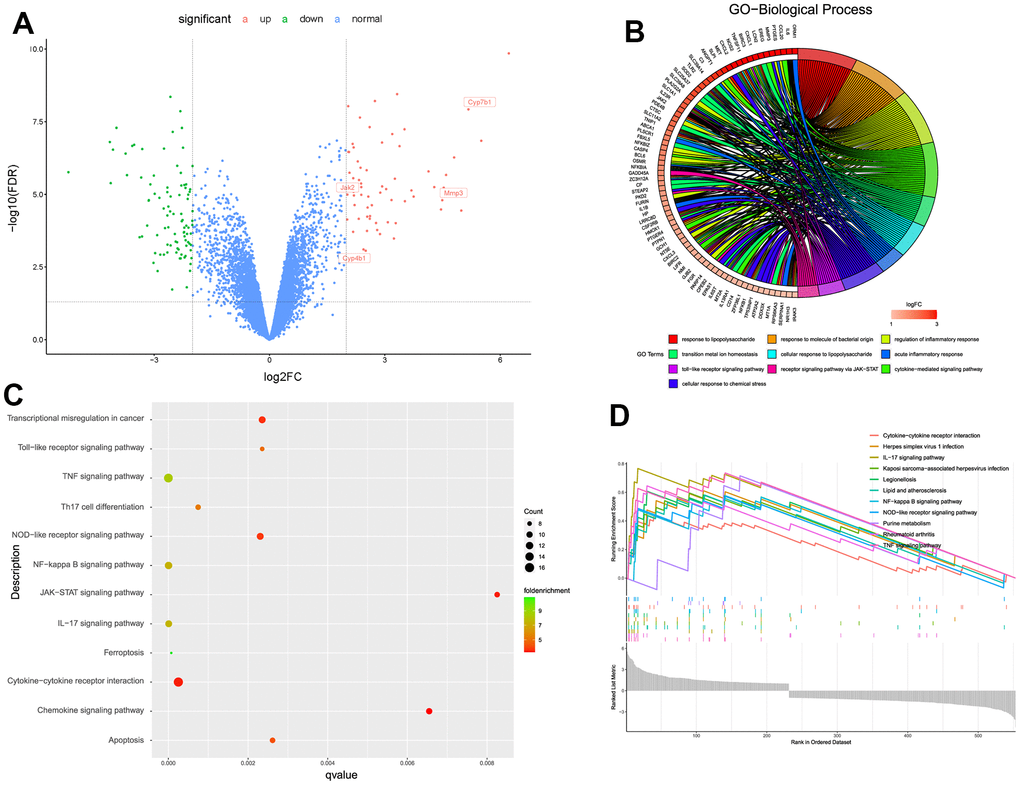 Then we conducted biological functions and aberrantly pathways analysis based on the up-regulated DEGs, for further knowledge information about the pathological processes in the progression of IDD. As shown in Figure 2B, results illustrated that the up-regulated genes mainly participated in inflammatory-related responses like “inflammatory response”, “cytokine-mediated response” and “cellular response to lipopolysaccharide” etc. And results also analyzed several aberrantly activated signaling pathways such as TNF, NF-κB, JAK-STAT, IL-related, and apoptosis signaling pathways (Figure 2C, 2D). These biological functions and pathways exhibited valuable roles, that they both may regulate the development of IDD, which were worth further discovering the potential natural materials based on the specific signaling pathway.