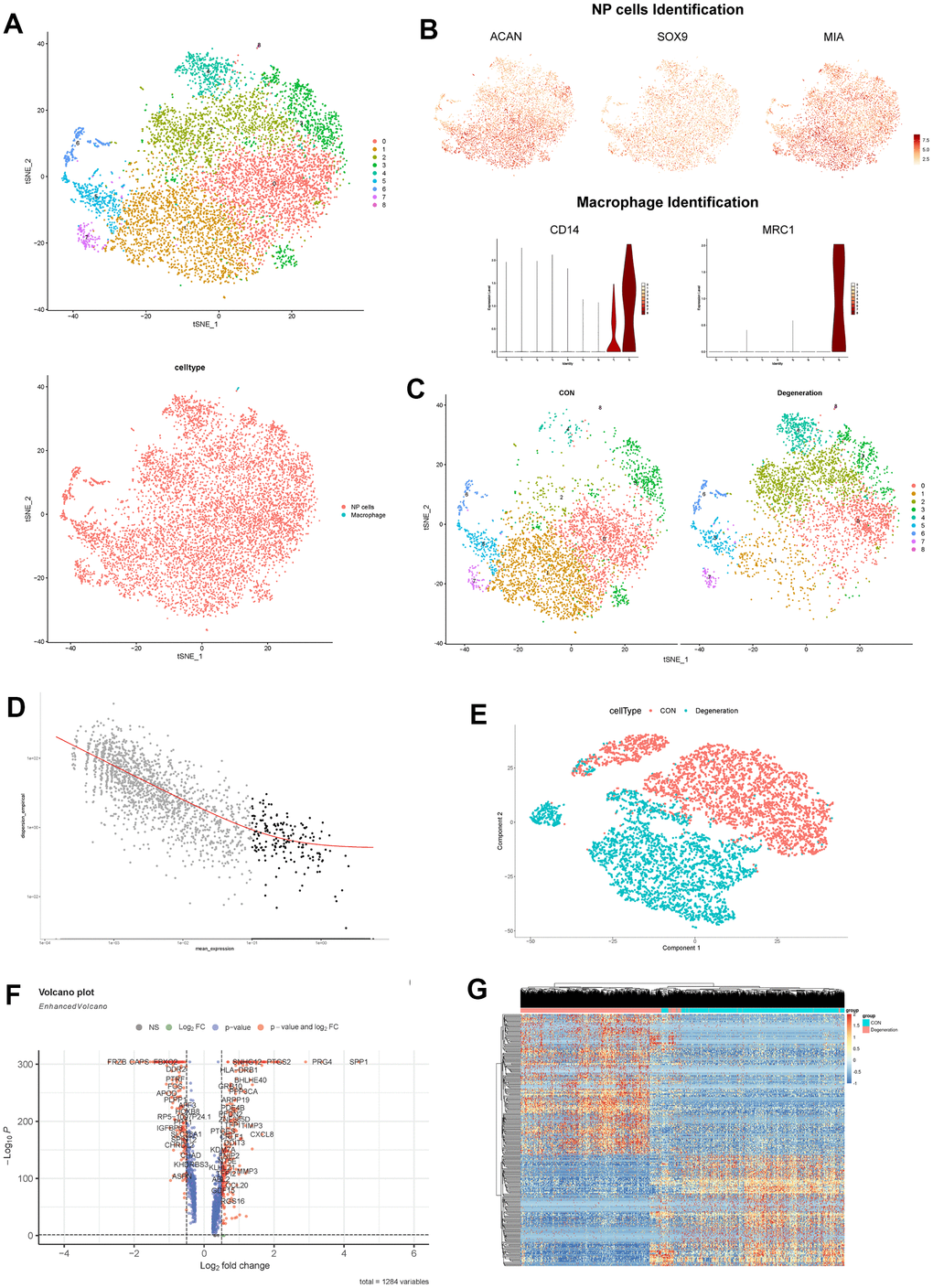 After dimensional reduction method by “tSNE” algorithm, the single-cell Seurat object generated 9 distinct clusters (Figure 3A), which were annotated for 2 main cell populations, including macrophages and NP cells. The NP cells were annotated by markers of SOX9, ACAN, and COL2A1 (clusters 0-7) [44, 45]; and macrophage cells were annotated by markers of CD14 and MRC1 (cluster 8) [46], as shown in Figure 3B.