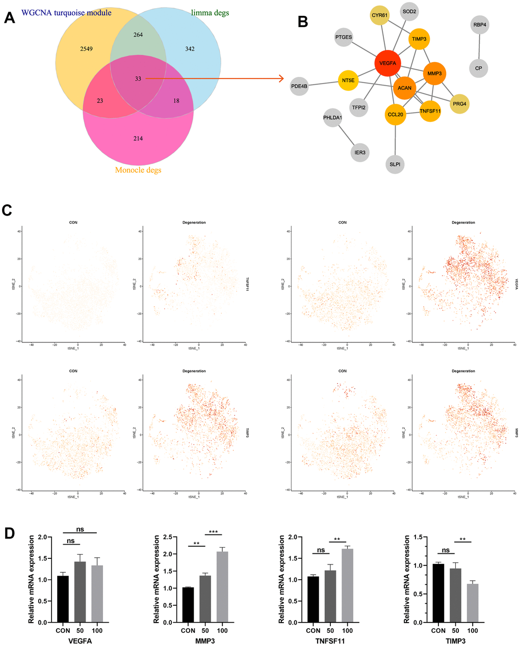 The primary Rat nucleus pulposus (NP) tissues were collected from animal center of Air Force Medical University. This study protocol was authorized by the Ethics Committee of Xijing Hospital, Air Force Medical University. Tert-butyl hydroperoxide (TBHP) were purchased from Sigma-Aldrich (CAS No. 75-91-2, St. Louis, MO, USA). After primary NP cells were simulated with different concentrations of TBHP (50, 100 μM), this study conducted qRT-PCR to detect the relative expression of the hub genes VEGFA, MMP3, TNFSF11, and TIMP3, respectively, to verify the hallmark genes in the progression of IDD.