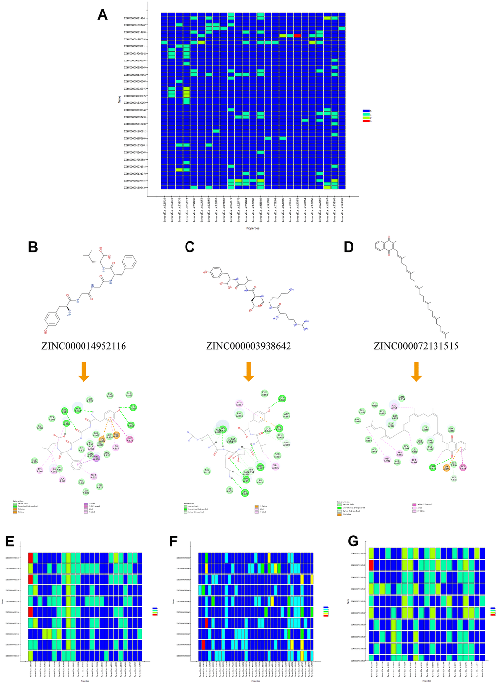 Small molecules binding to arginine residues region may inhibit the active sites of JAK3 and thereby suppressing its functions, which was an essential regulatory site of JAK3 and behaved pivotal roles in regulating its function. The chemical structure and Ramachandran information of JAK3, as well as docking conformation of FM-381-JAK3 complex were illustrated in Figure 5A–5D. After high-throughput screening method from amounts of prepared ligands based on Libdock module, altogether 13653 compounds from ZINC15 database bound successfully at the active region of JAK3 protein, 1028 compounds had higher Libdock scores (range from 127.612 to 212.521) than the reference compound (Libdock score: 127.568). The Libdock scores of the top 50 compounds were shown in Table 1, which were screened as candidate compounds. Besides, the heatmap displayed the interactive roles between ligand residues of the top 50 compounds and JAK3 (Figure 6A). The chemical structures of the top 20 compounds were also illustrated in Supplementary Figure 2.