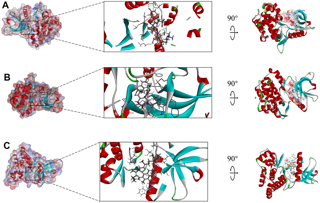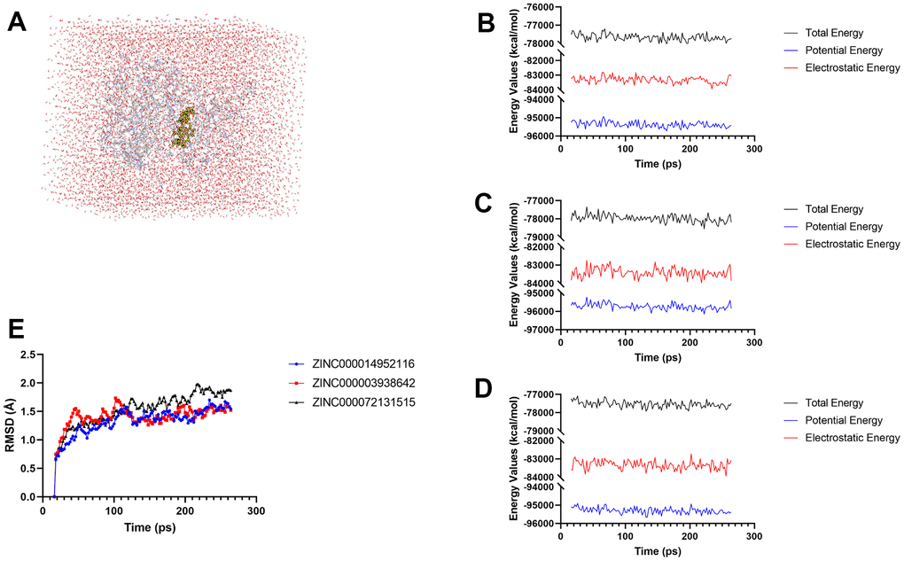 After analyzing the docking patterns, the stabilities of these generated complexes under in-vivo situations were then assessed by molecular dynamics simulation experiments (Figure 9A). RMSD and energy values curves of each complex were illustrated based on the initial conformations through the CDOCKER module. Energy values of these three complexes including total energy, potential energy as well as electrostatic energy began to level off with time (Figure 9B, 9C); the RMSDcurves of these complexes attained equilibrium after 130 ps (Figure 9D). The above results demonstrated that these chemical bonds between compounds and JAK3 help to maintain the homeostasis of these complex.